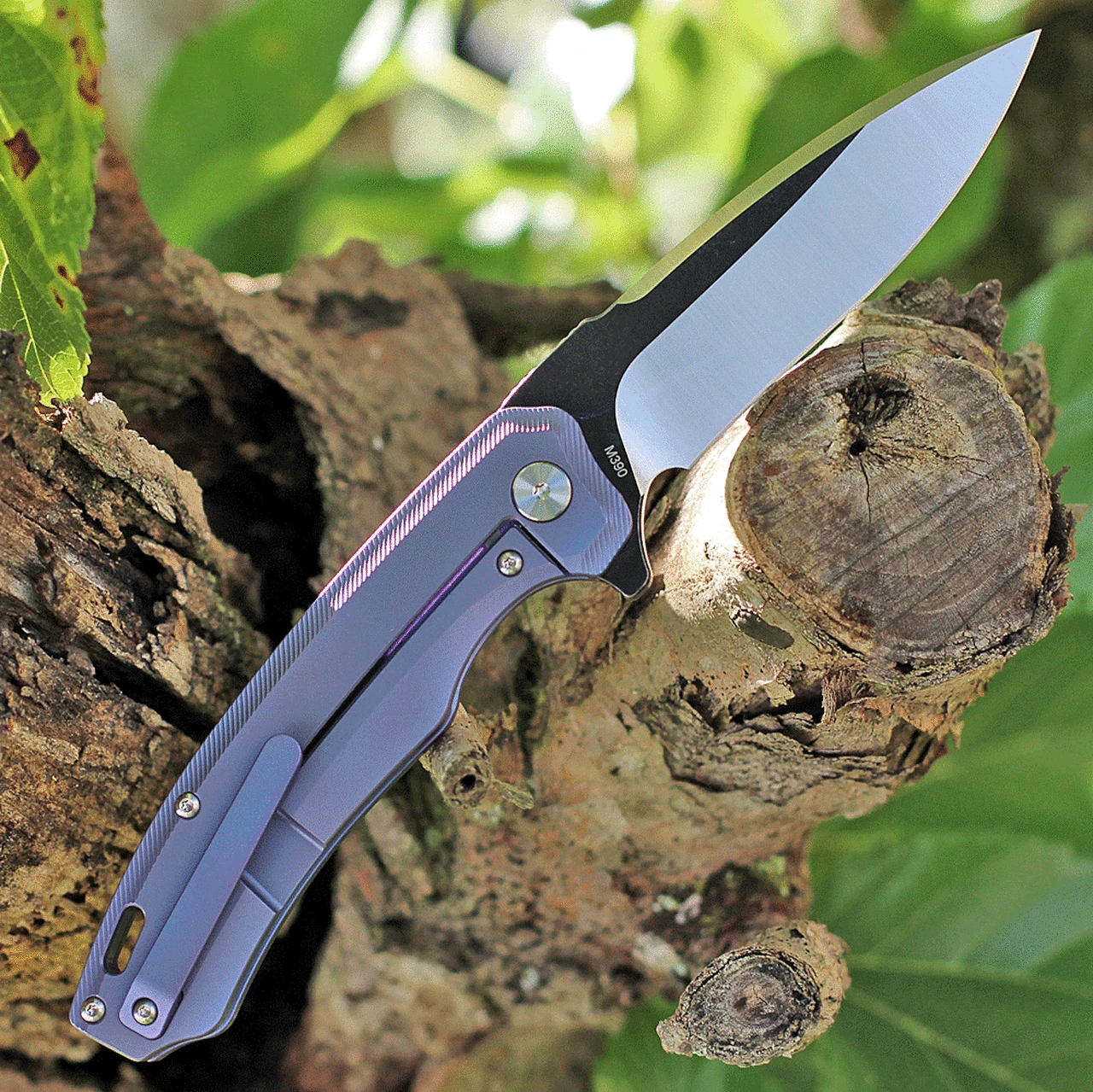 The QSP Woodpecker is the top-of-the-line QSP model. It has a titanium frame lock with milled scales and a milled pocket clip. It has a Bohler M390 blade with a flat grind. The flipper action is smooth as butter, and has a ceramic ball bearing pivot helping it.