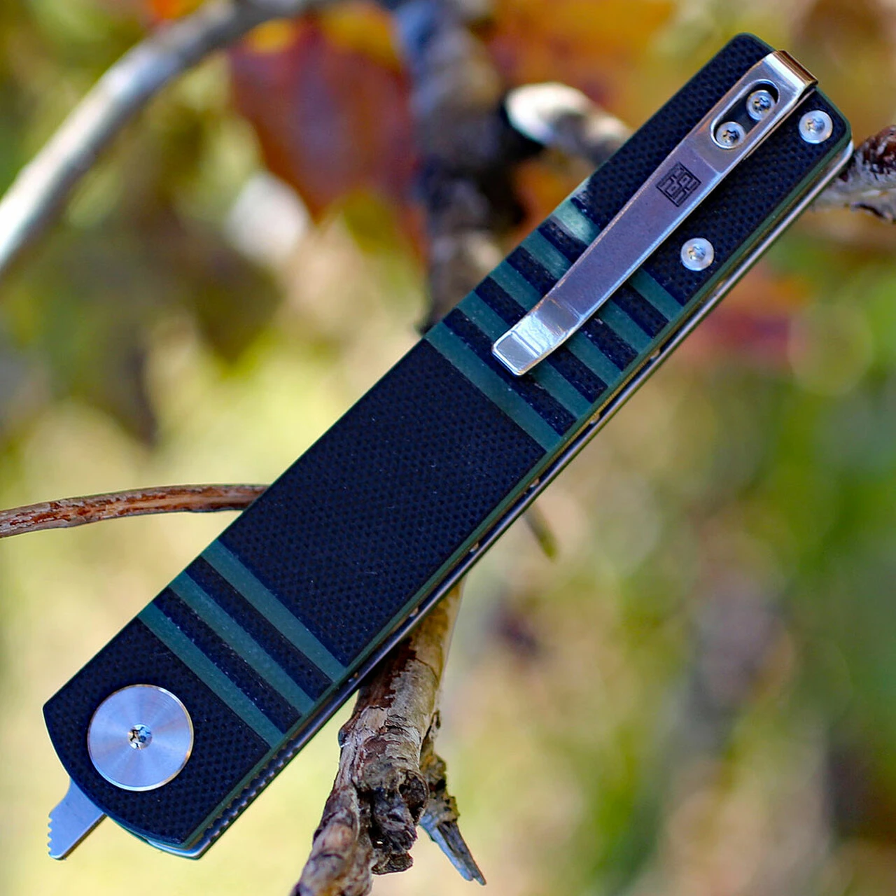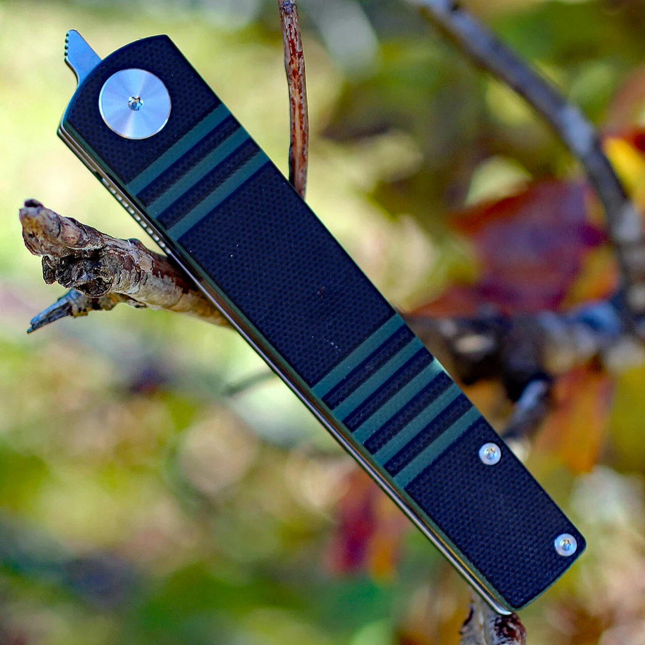 The knife has been designed as a front flipper having a visually striking and somewhat seldom seen flipper tab arising from the head. A block backspacer was intentionally left out, instead being replaced with a ‘bird cage’ column structure that maximizes safety preventing the risk of damage to the blade when closing and also creating a strong and sturdy structure.