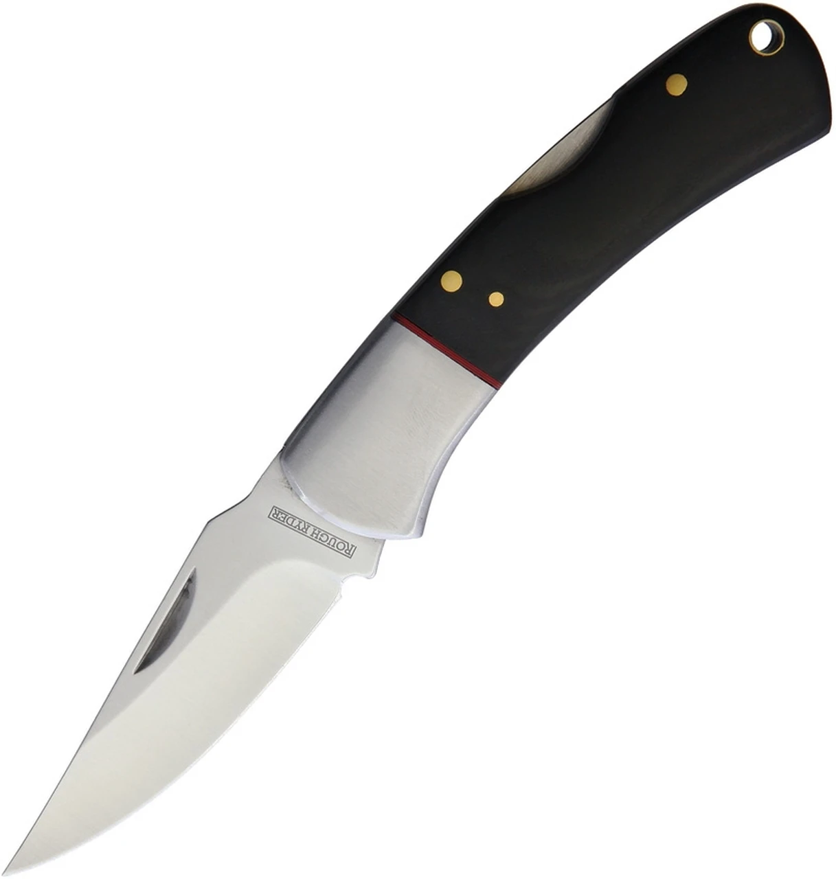 The Rough Ryder Highland II Lockback measures 4″ closed and features a 2.75″ 440A Stainless Steel clip point blade with a match strike pull. The handle material is black Micarta. This handle includes brass pins, stainlesss steel liners, red and brass spacers, stainless steel bolsters, and a lanyard hole.
