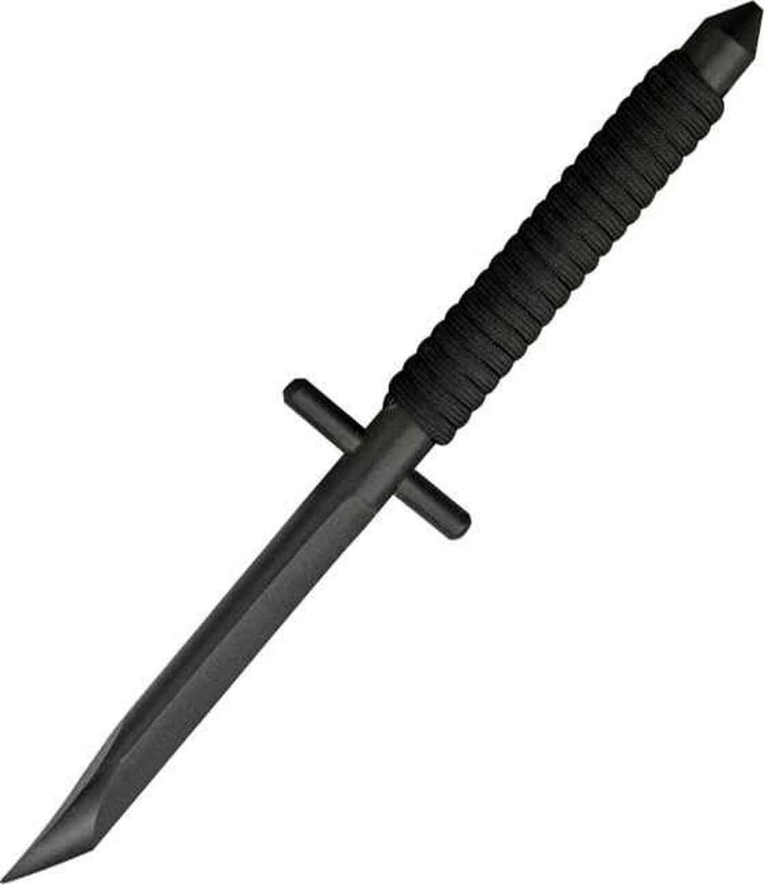 Shadow Tech Scorpion. 9″ overall. 4″ black finish O1 tool steel cylindrical blade with steep grind gives the knife added strength for maximum penetration. Black paracord wrapped handle. Double guards for a firm non-slip grip. Black molded Kydex sheath with clip. Clip can be switched to provide several different carry options. 100% of the components of each Shadow Tech knife, including the screws, are Made in the U.S.A.