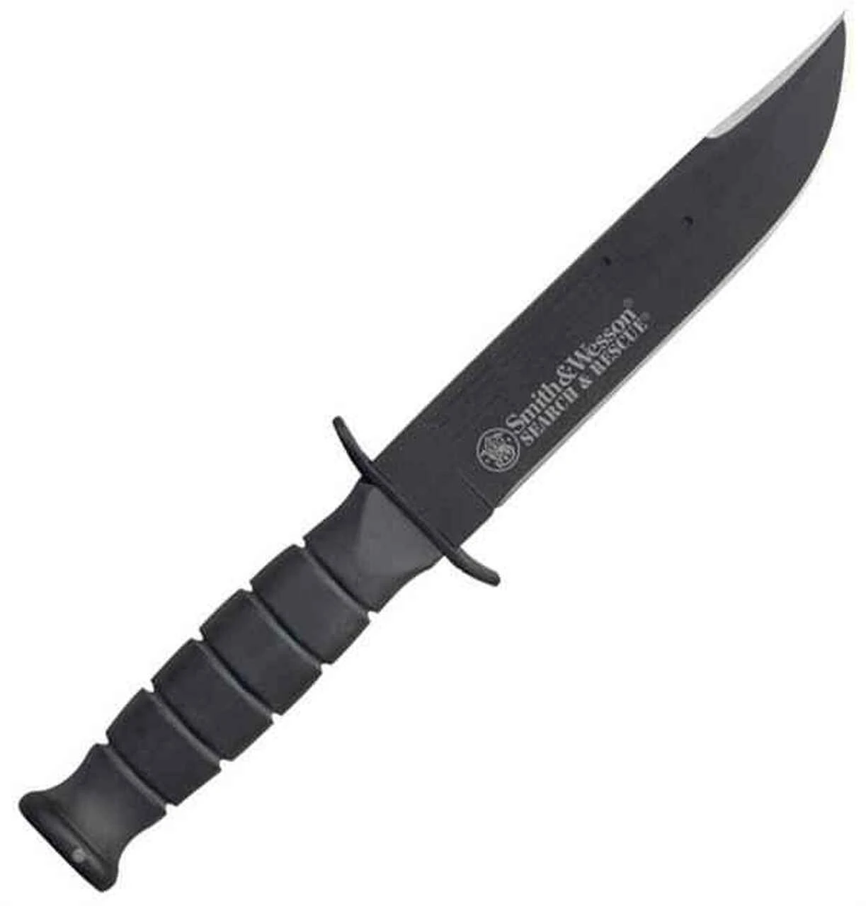 S&W Search & Rescue Marine Combat. 10 3/8″ overall. 5 7/8″ black powder coated 440C stainless bowie style blade with “Search & Rescue” and Smith & Wesson logo etching. Grooved black rubberized aluminum handle. Black finish guard and pommel. Heavy black Cordura belt sheath with hardshell liner and stone pocket.