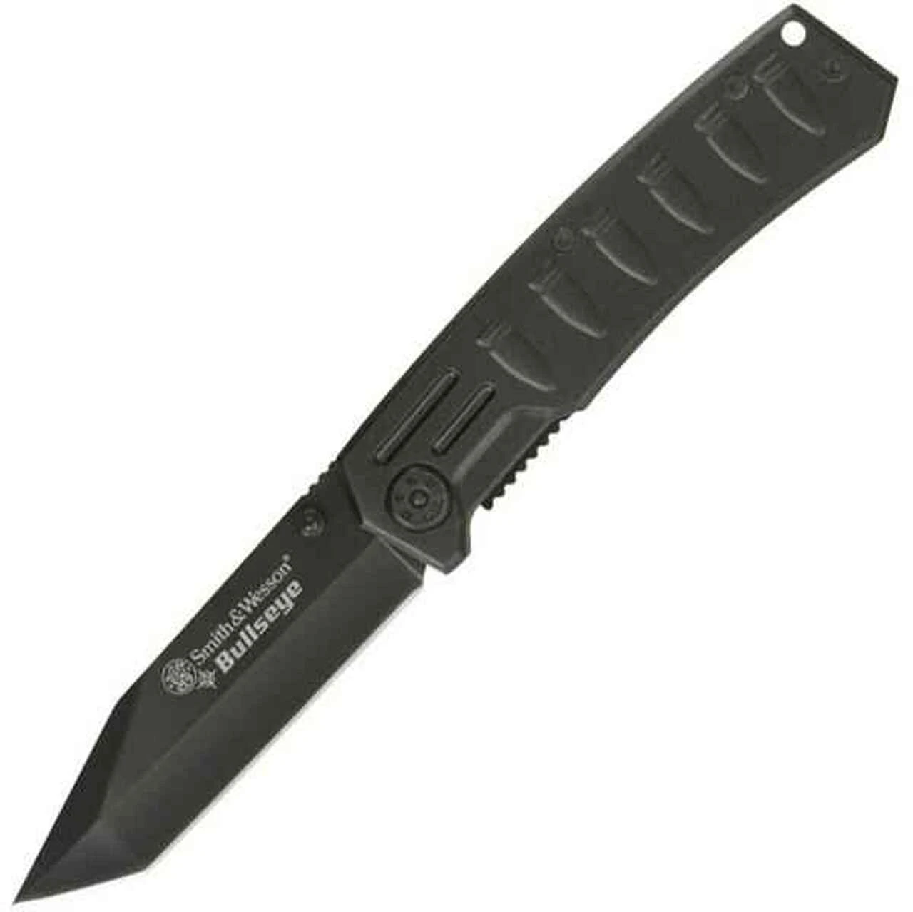 Smith & Wesson Bullseye Linerlock. Standard edge blade. 4 1/2″ closed. 3 1/2″ black finish stainless tanto blade with dual thumb studs and Bullseye etch. Black finish stainless handles with raised bullet embossing. Lanyard hole. Black finish metal pocket clip.