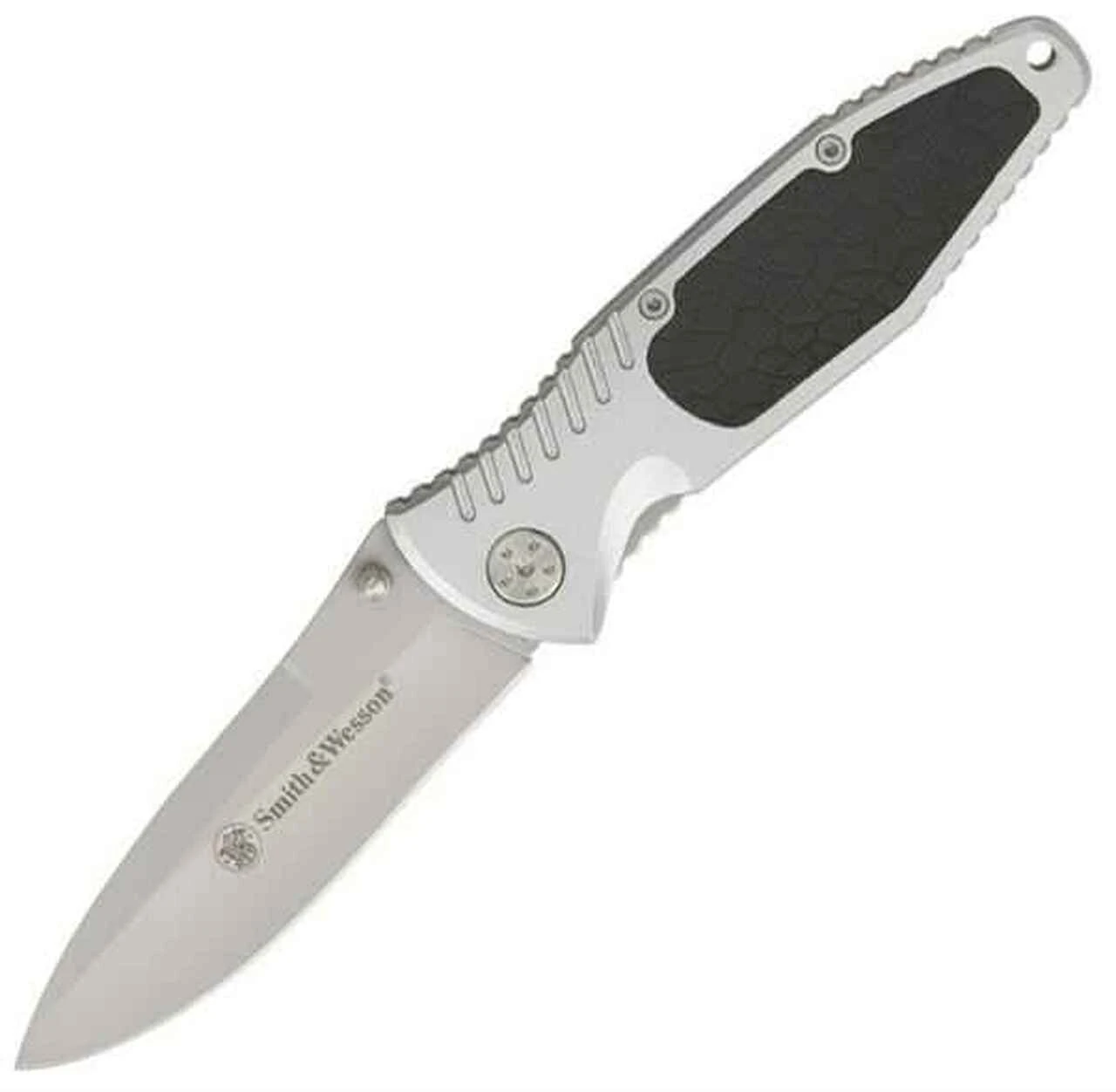 Smith & Wesson Bullseye Linerlock. 4 1/2″ closed. Matte finish drop point blade with dual thumb studs. Silver finish metal handles with rubber inlay on front. Stainless pocket clip.