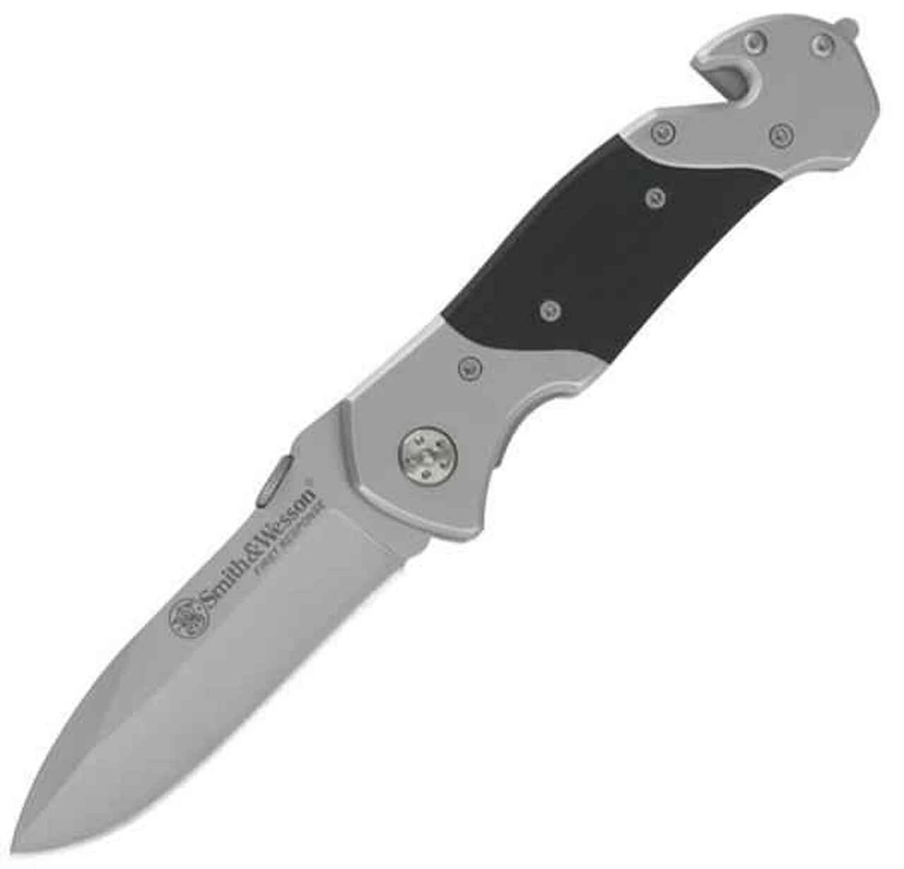 Smith & Wesson First Response Folder. Standard edge blade. 4 5/8″ closed linerlock. Matte finish stainless blade with thumb lug. Blade is etched First Response. Matte finish stainless frame with black sure grip inlay handles and integrated seat belt cutter and glass breaker. Stainless pocket clip.