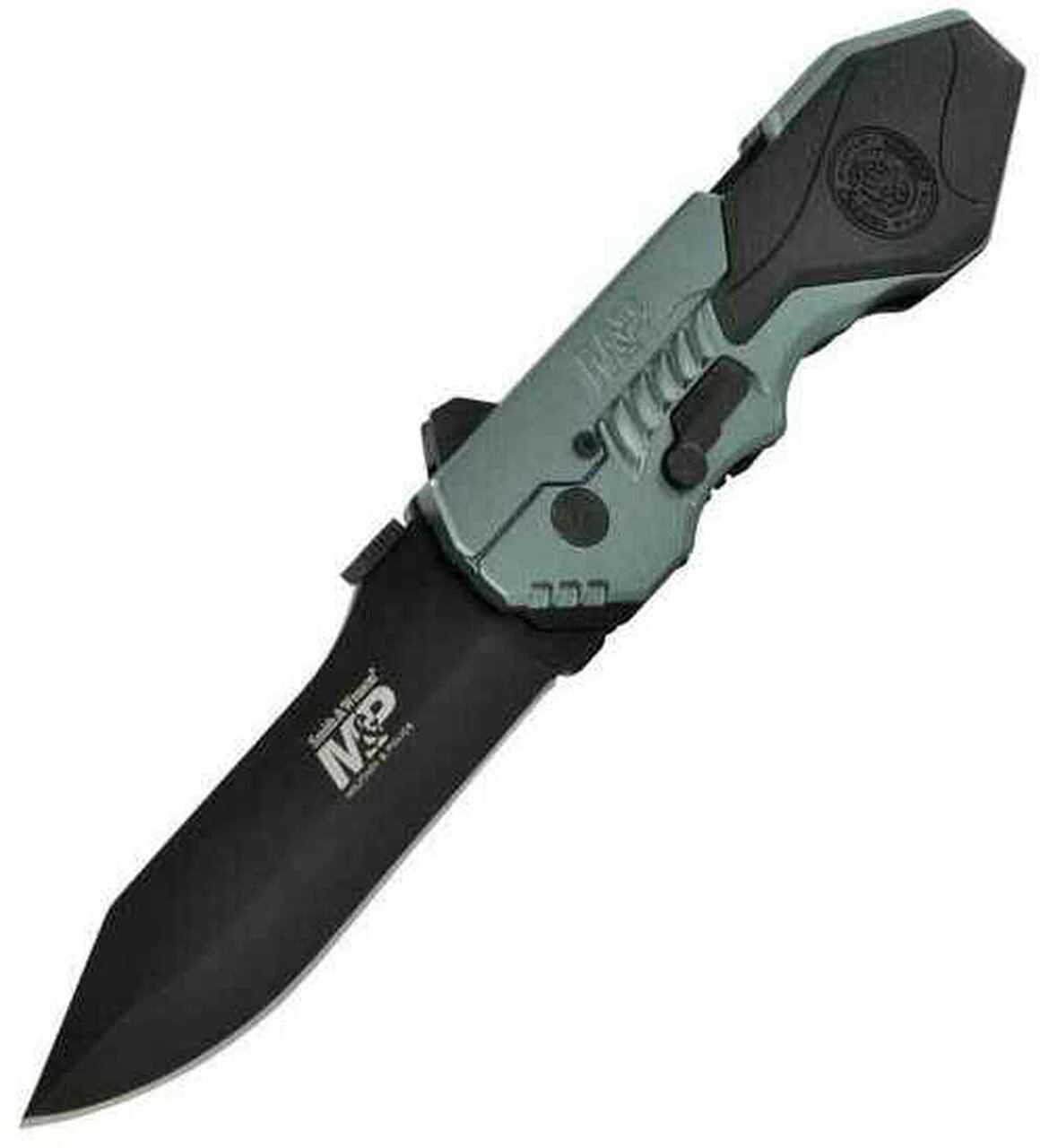 S&W M&P Linerlock. (Military & Police) Large Assisted Opening. – 2nd Generation. 5″ closed. Black finish 4034 stainless standard edge assisted opening blade with thumb lug. Blade is etched M&P. Gray aluminum handles with black sure grip rubberized inlay. Integrated glass breaker. Pistol style side safety lock. Black finish stainless pocket clip.