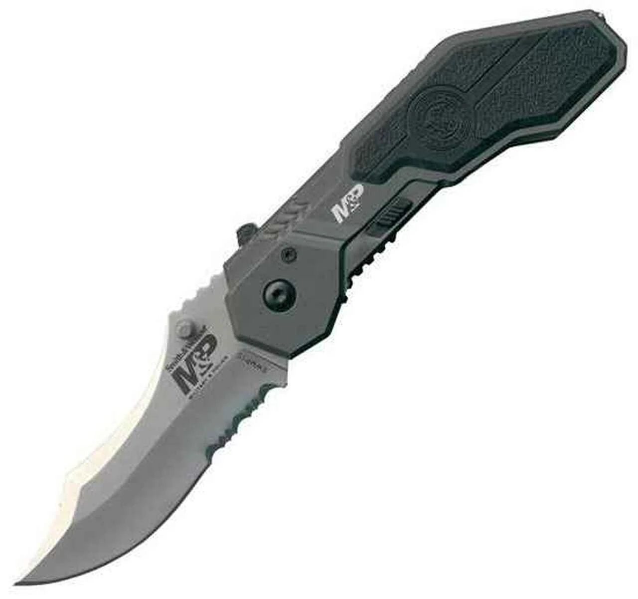 S&W M&P1 Assisted Opener Partially Serrated. M&P (Military & Police) Linerlock. 4 1/4″ closed linerlock. 4034 stainless tactical style blade with dual thumb studs. Matte finish blade. Dark gray anodized aircraft aluminum handles with black rubberized inlay and integrated glass breaker. Black finish stainless pocket clip. M.A.G.I.C. assisted opening blade.