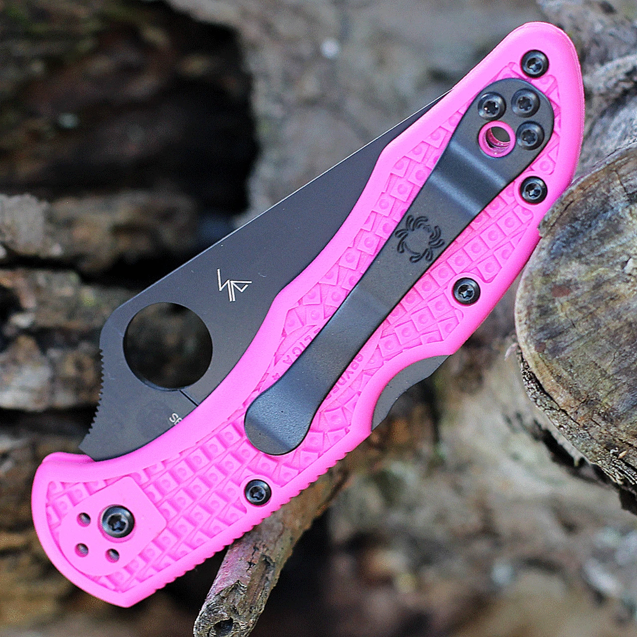 Since its introduction 30 years ago, the Delica has been the platform for dozens of different combinations of blade steels, handle colors, and handle materials. Black and pink is a bold color combination. This stunning variation of the Delica 4 Lightweight combines a titanium carbonitride (TiCN) coated CPM S30V stainless steel blade with a bright pink fiberglassreinforced nylon (FRN) handle. To complement the rich, black finish of the blade, its four-position pocket clip and all other handle hardware also sport matching black coatings.