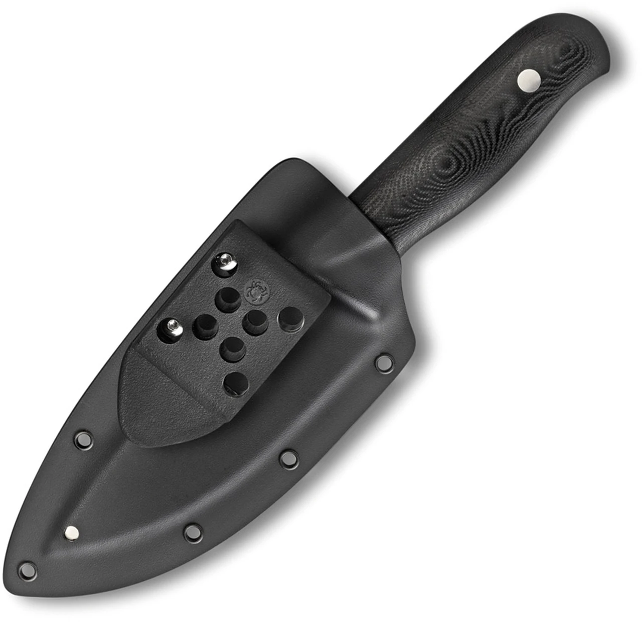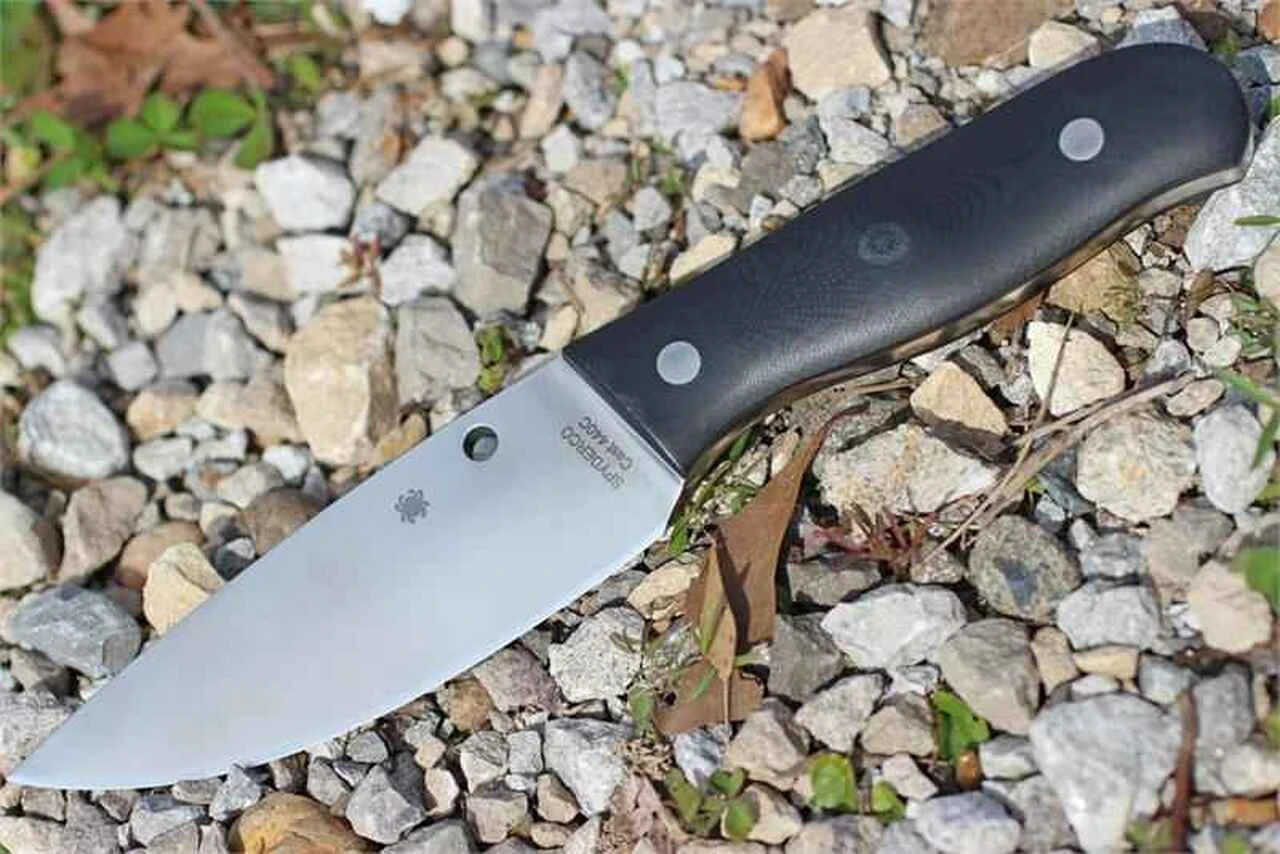Spyderco Serrata FB32GP, CAST 440C Steel, Black G-10 Handle, PlainEdge Stuart Ackerman is a custom knifemaker from New Zealand with a penchant for practical fixed-blade knives that you can count on in a pinch. His serrata design definitely fits that description. Its thick, leaf-shaped blade is made by casting 440C stainless steel, a process that creates dendritic (“Tree-like”) crystalline structures that give it exceptional strength, ductility, and cutting ability. The blade is full-flat ground for strength and has a distal taper to reduce weight, enhance edge geometry, and provide and exceptional balance. Its contoured handle scales are made of skeletonized full-tang black G-10 handle scales and are meticulously shaped to fill the hand while eliminating “hot spots”. the Serrata comes complete with a custom-molded Boltaron sheath with G-Clip attachment.