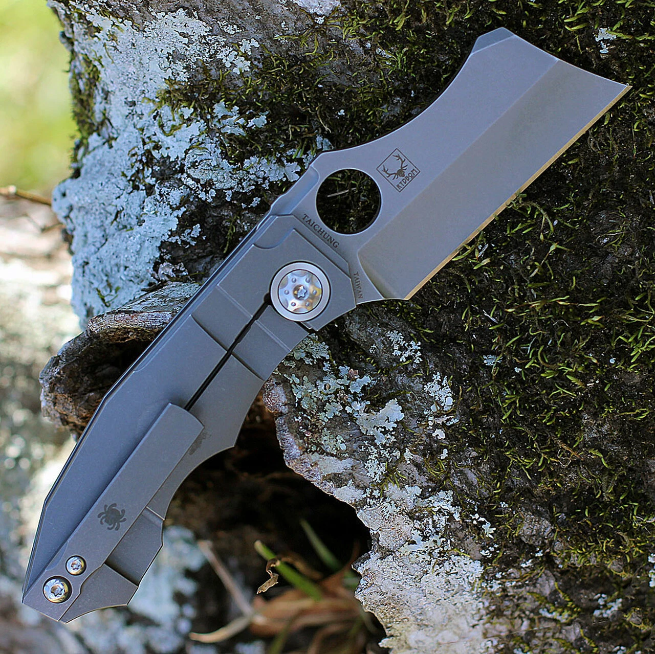 This knife was inspired by custom knifemaker David Rydbom’s “Bill the Butcher” design, the Stovepipe blends dramatic style with serious performance. Its stout cleaver-shaped blade is crafted from 4mm (.157-inch) thick CPM® 20CV stainless steel and has a deep hollow grind for superior edge geometry. The handle is constructed from two slabs of solid titanium joined by a titanium backspacer. Both scales are painstakingly machined to create beautifully crowned outer surfaces and the reverse-side scale forms the foundation of the knife’s Reeve Integral Lock (R.I.L.) mechanism.