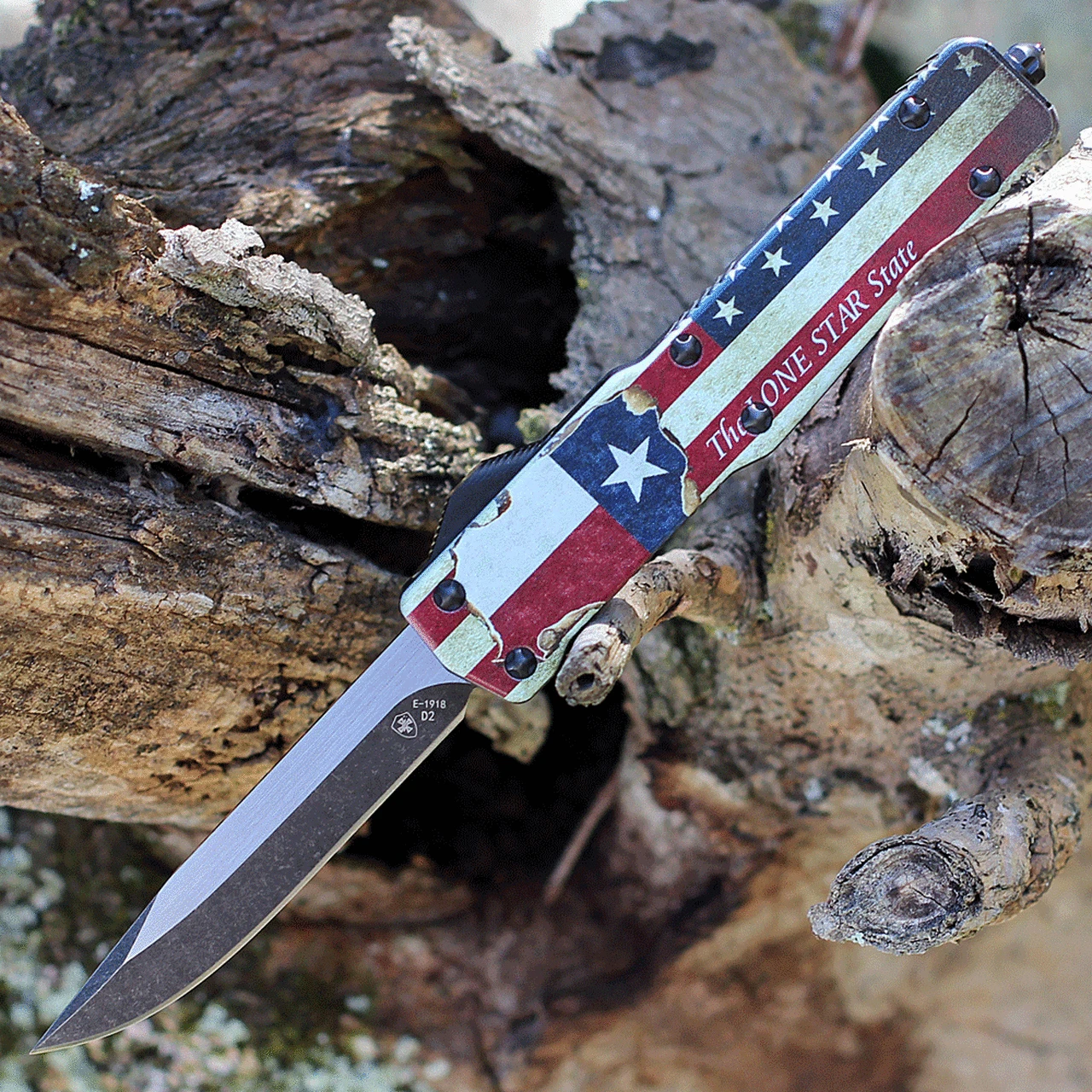 Templar Knife Premium Lightweight Series – Slim OTF Automatic (MA-TX-32-1) – 3″ Powder D2 Black SW Drop Point, Aluminum RWB Texan Handle