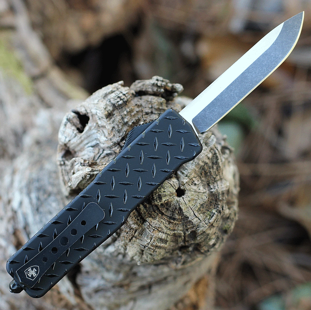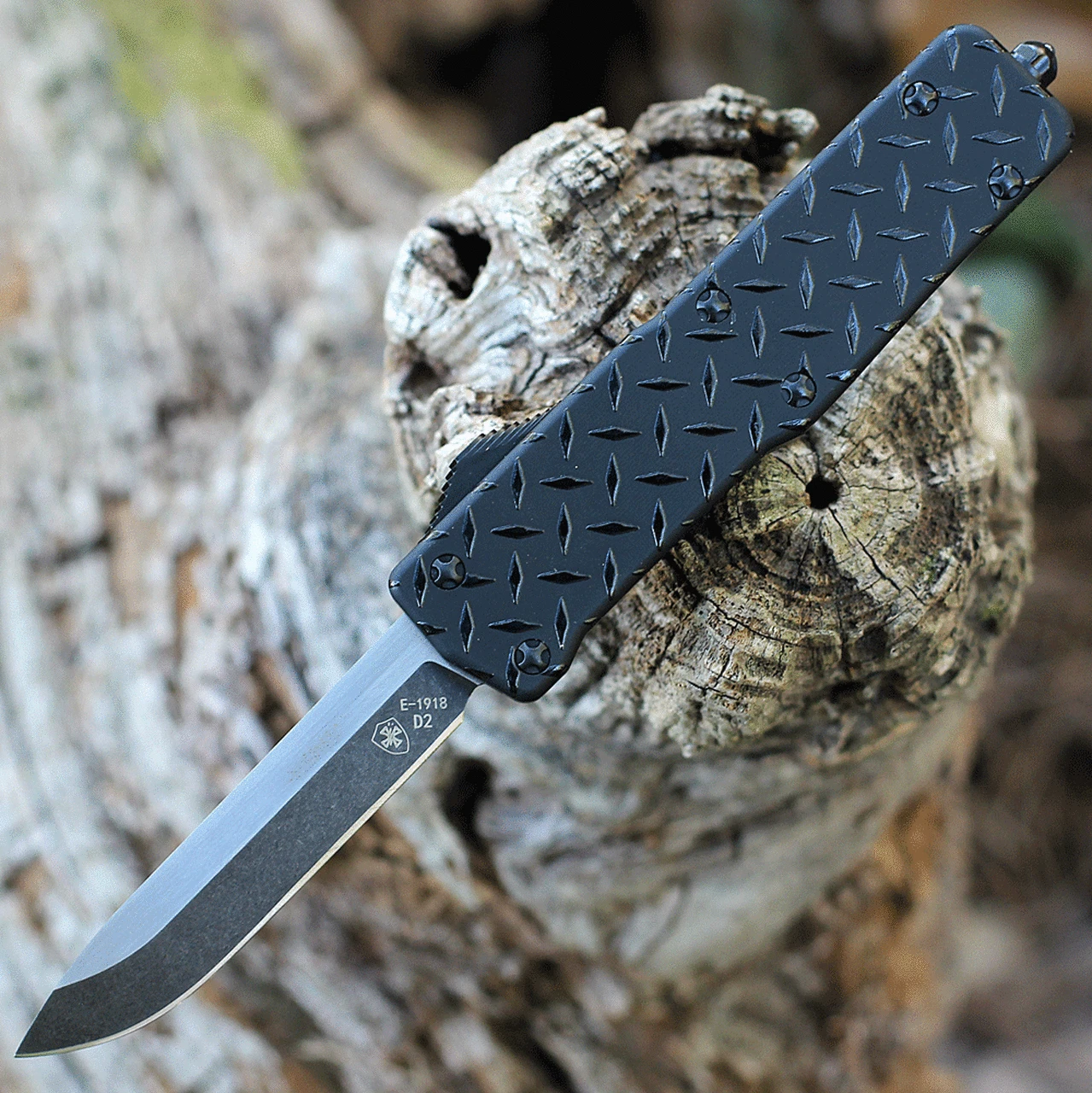 Templar Knife Premium Lightweight Series – Small OTF Automatic (SA-DPG-32-1) – 3″ Powder D2 Black SW Drop Point, Black Aluminum Diamond Plate Handle
