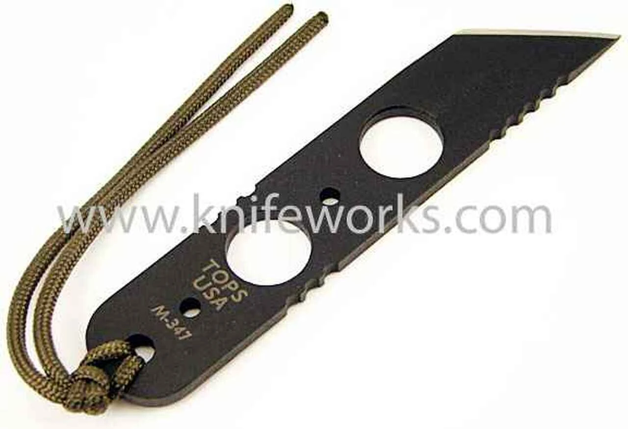 Tops ALRT (Anywhere Last Resort Tool). 5 3/8″ overall. 1 1/2″ cutting edge. Skeletonized one piece 1095 high carbon steel construction with black traction coating. Lanyard. Black Kydex sheath with carabiner clip with beaded neck chain.