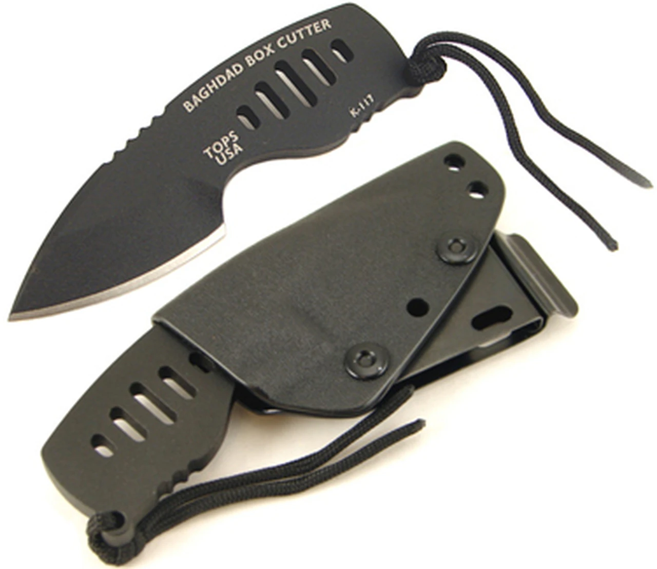 Tops Baghdad Box Cutter. One piece 1095 high carbon steel construction with black traction coating. Lanyard. Black Kydex sheath with carabiner style clip.