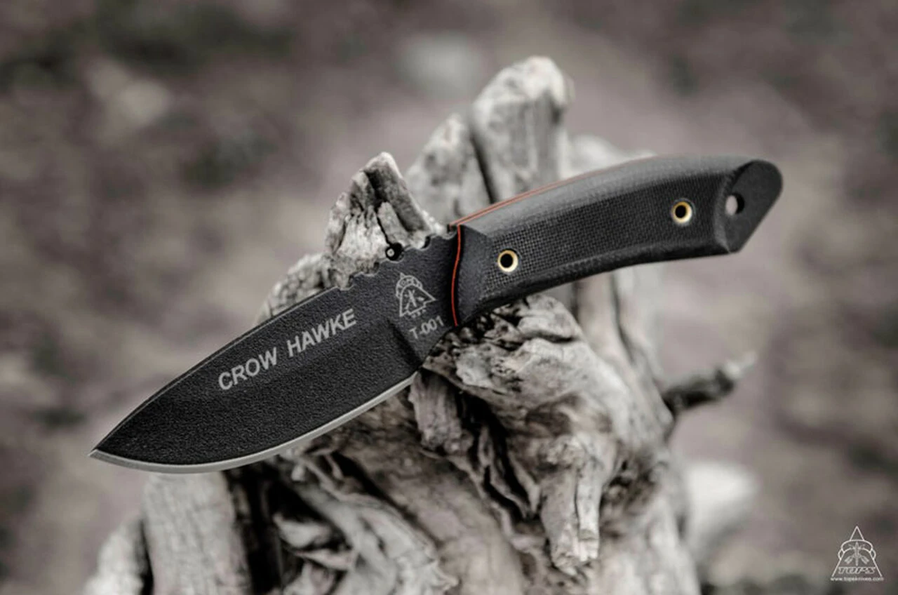 The CROW HAWKE has the same exact dimensions as its brother from another mother, the SPARROW HAWKE. The updated finish and handle on the CROW HAWKE breathes new life into an old favorite. This woods knife was designed with the Hawk in mind. A Hawks talons, which are used to catch and hold prey are razor sharp and very formidable, just like this knife. The CROW HAWKE is a sturdy Neck/EDC tool with a great design. Its so small and lightweight, you wont even notice youre carrying it. Yet it will attack smaller woodworking tasks, processing cardboard boxes, and other EDC work quickly, accurately, and ferociously. The CROW HAWKE is a great addition to bug-out bags, 72-hour kits, and other emergency prep kits because it will take almost