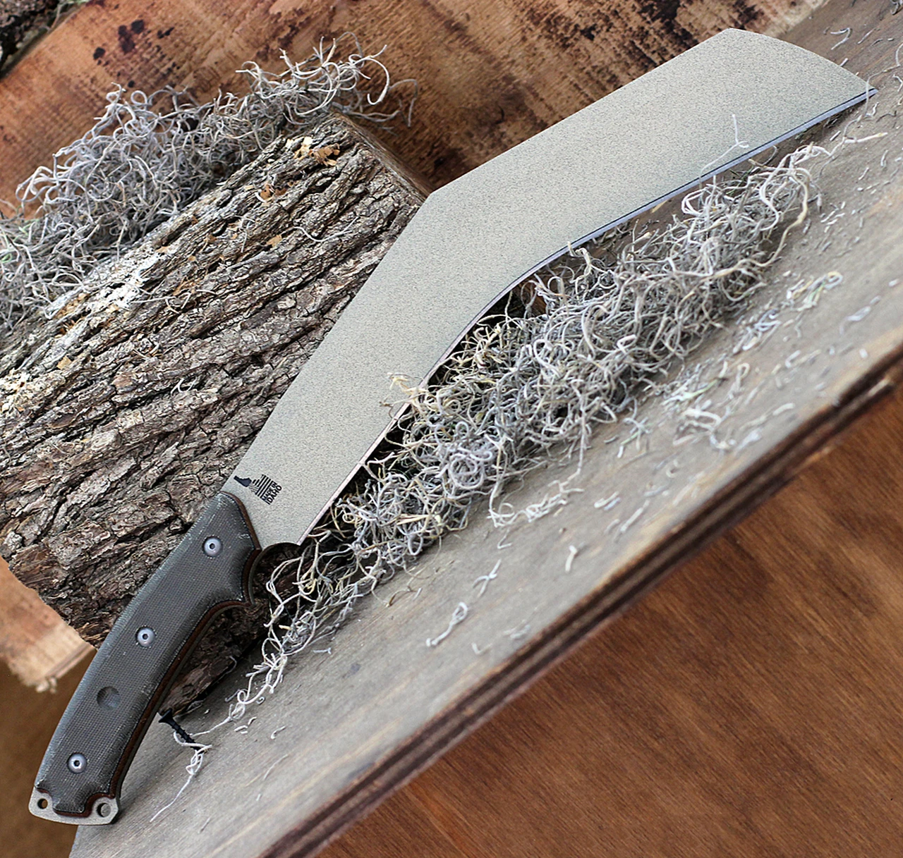 Leo wanted a large kukuri-like chopper, but not an actual kukuri. So, The Bestia was born by melding El Chete – already one of TOPS’ most popular workhorses – with a kukri, to create a true beast in chopping ability. The long, forward curved blade and weight behind it bites deep with each swing and the tan traction powder coating will protect the blade for years to come. The handle is also long enough to hold in 2 positions. One for full on chopping and one for more controlled and even fine cuts. What really makes this knife comfortable to wield are the sandwiched Micarta handles that are thick, but well-contoured. The open-backed Kydex sheath with a leather dangler attachment make it easy to carry given its size.