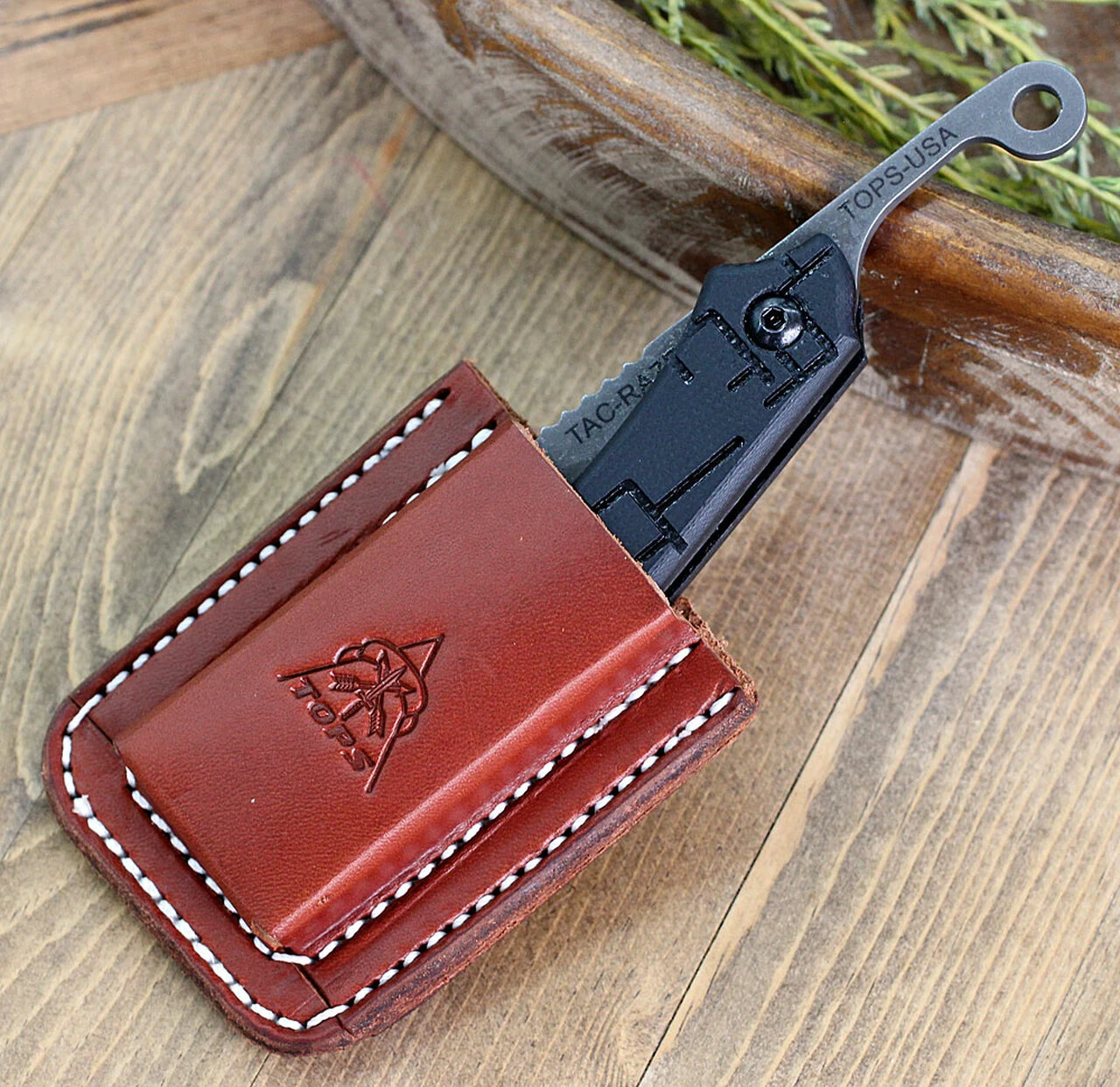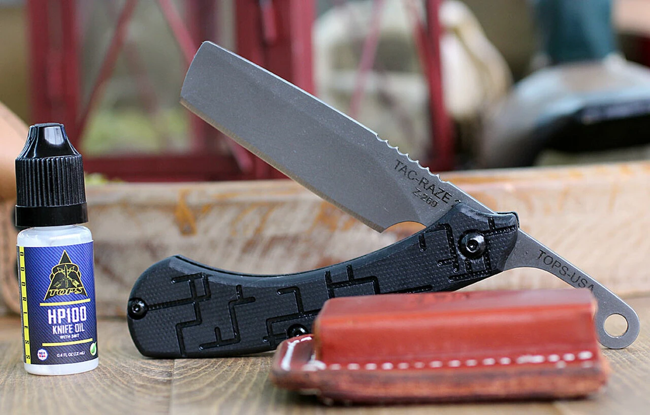 The TOPS Tac-Raze is a modern interpretation of a classic razor design. TOPS owner Leo Espinoza carefully designed this knife, making it more akin to a practical EDC folder than your grandpa’s old straight razor while keeping its roots intact. Right off the bat users will notice there is no lock, as the knife is a friction folder design which can be held into place by placing your hand over the extended blade tang. The Tac-Raze 03 has a durable Black G10 handle, high quality leather sheath for carry and Black River Wash finished, 1095 “straight razor” style blade.