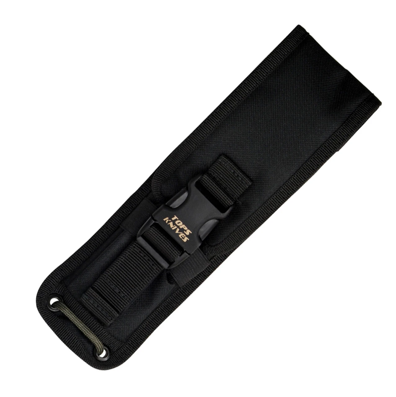 TOPS XcEST Bravo (Cross Country Emergency Support Tool) has a 440C stainless hunter point blade with black traction coating, sharpened top edge and thumb ridge. Full tang. Brown canvas micarta handles with a strong divot cut for fire starting. Handles can be removed to store extra small items. OD green lanyard. Tactical black ballistic nylon belt sheath with protective insert, leg ties and removable flap cover.