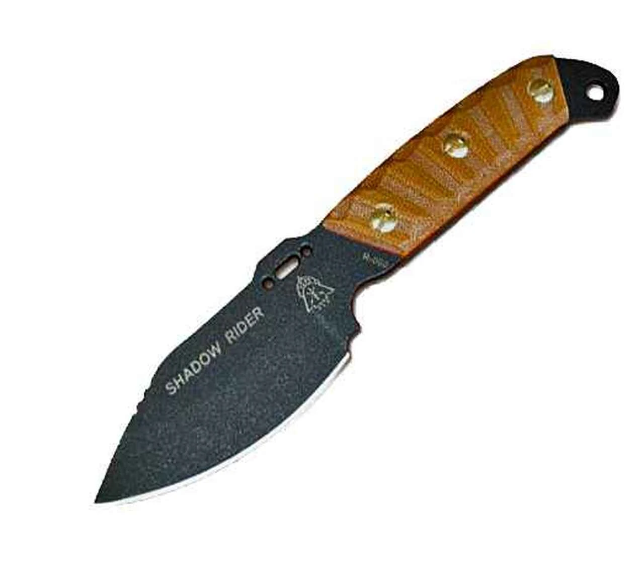 Tops Shadow Rider 7 3/4″ overall. 3 1/4″ 1095 high carbon steel blade with black traction coating. Black linen micarta handles.