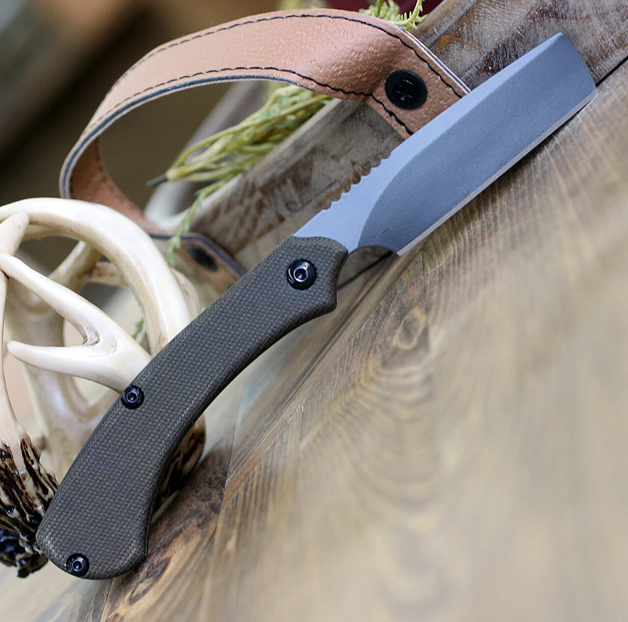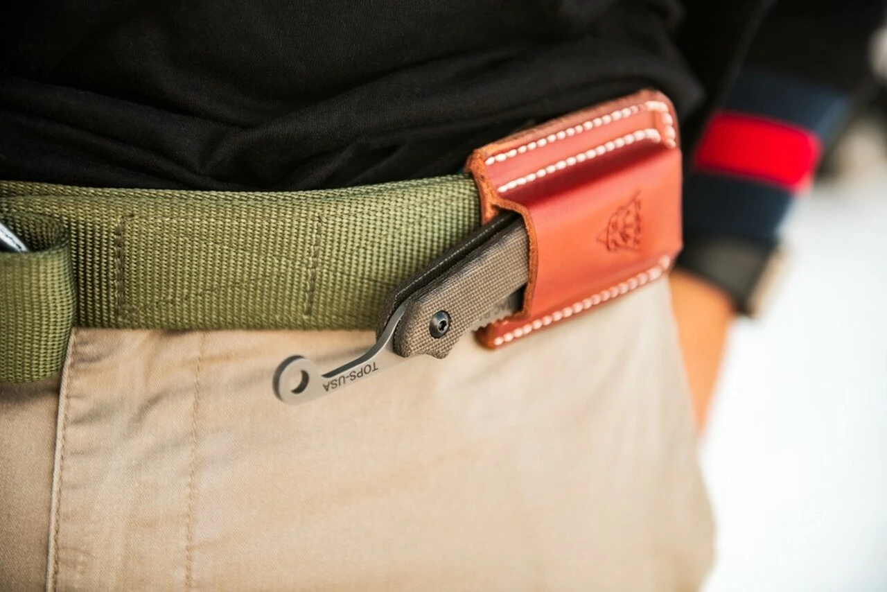 It comes with good-looking Green Canvas Micarta handles, TOPS’ famous Black River Wash finished 1095 with TOPS’ “signature” differential heat treat. The strong brown leather sheath can be worn vertically or horizontally on a belt for ease of carry whether open or concealed.