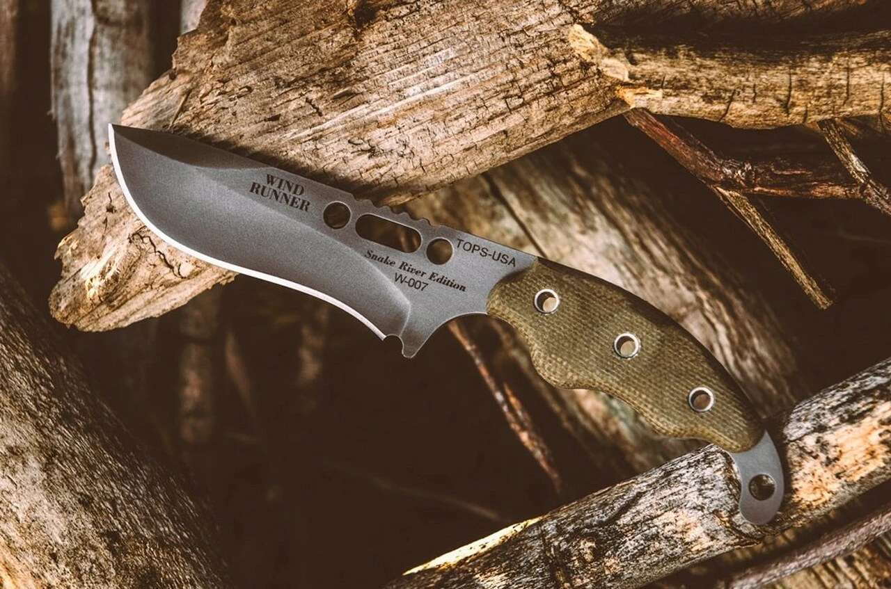The Wind Runner Snake River Edition is a re-worked version of a classic TOPS hunting knife. This new version sports our famous Black River Wash with green canvas Micarta handles to provide grip even when they’re wet. This is the smaller of the two Wind Runners and when purchased alone comes set up for neck carry. The recurved blade is excellent for slashing cuts, and the sweeping belly up to the subdued tip all make skinning small game a breeze. This small size is suited to handle processing fish, fowl, and smaller game animals in a lightweight package that is comfortable to use.