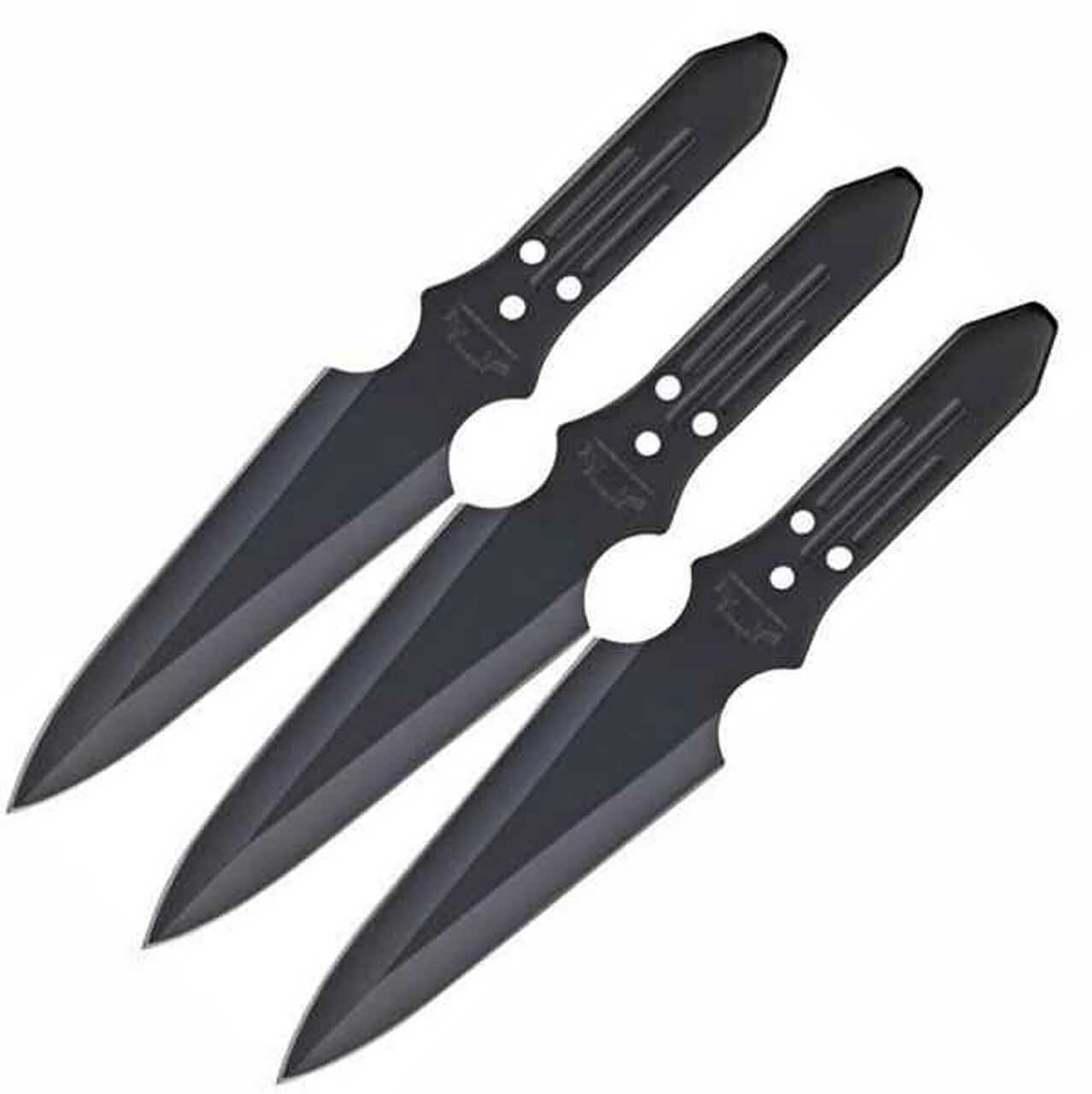 United Triple Thrower Set. Contains three 9 1/8″ overall throwing knives. One piece stainless construction with black finish. Black nylon sheath holds all three knives.