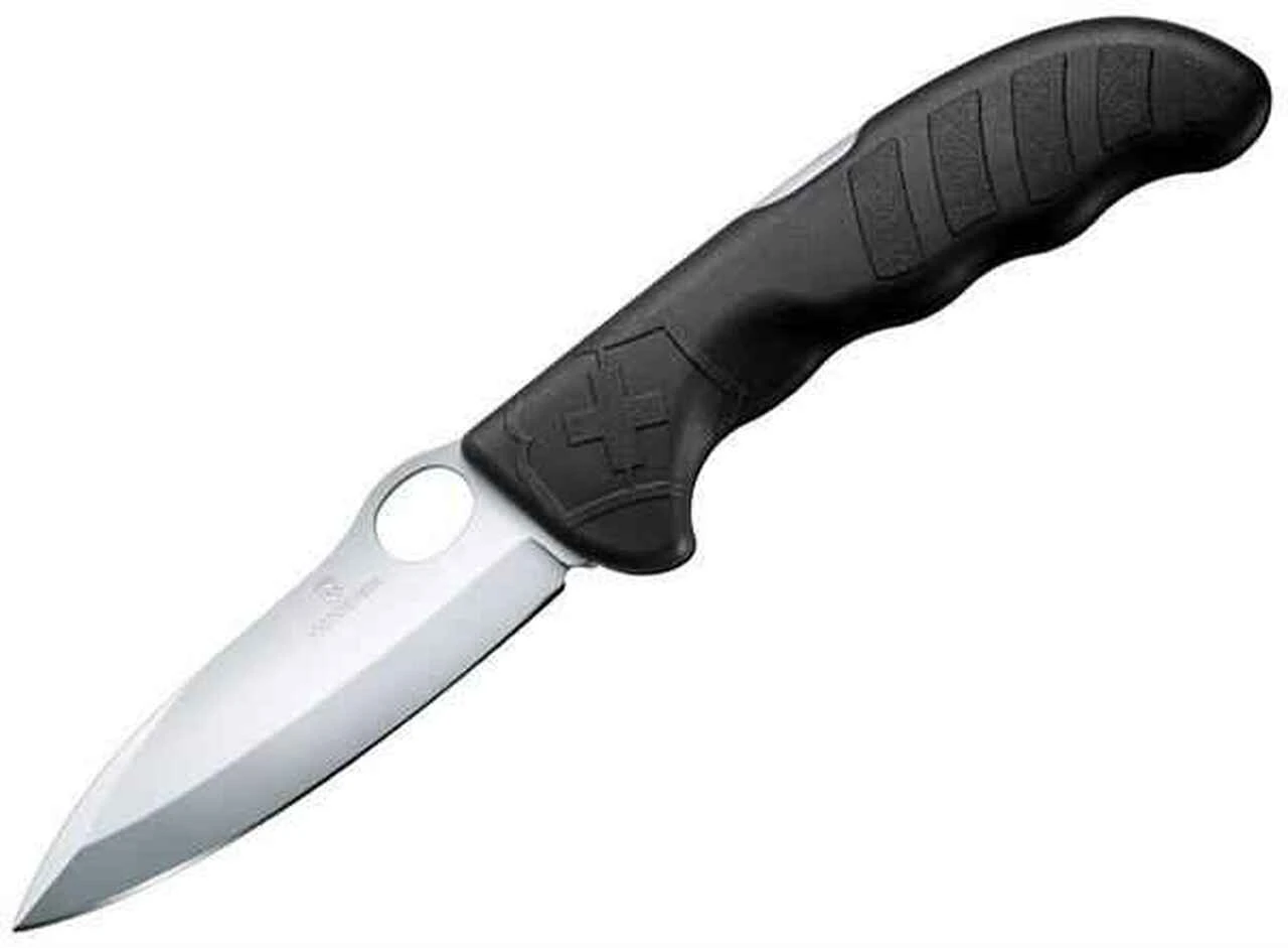 The Victorinox Swiss Army Hunter Pro Folding Lockblade provides one essential blade and is designed for easy, one-hand blade access. The heavy gauge stainless steel pointed blade locks securely into place for safety until the release is pressed. The handle of this folding lockblade is rugged, ergonomic and anti-slip, ensuring it will perform and you won’t loose your grip, even in wet conditions.