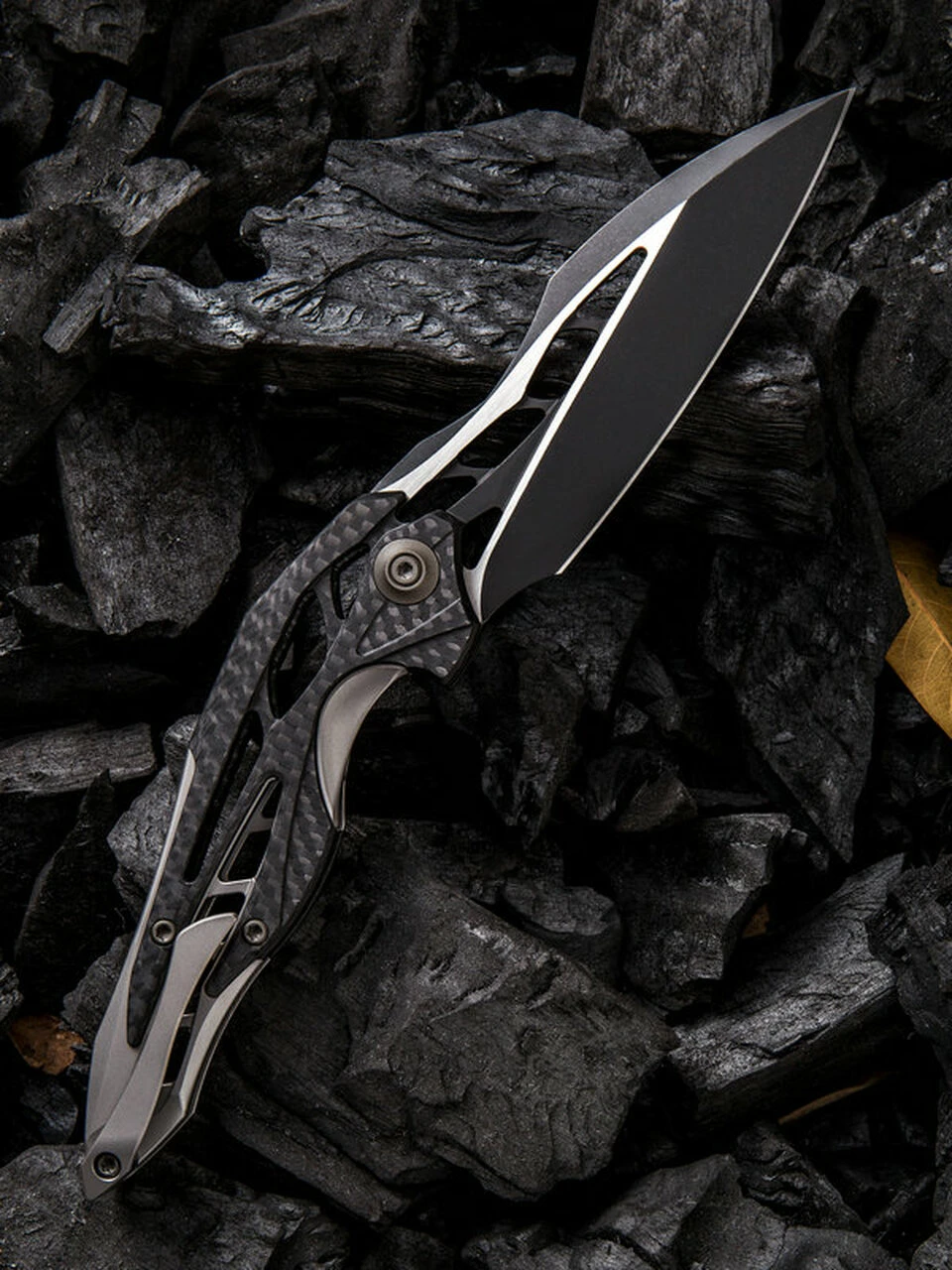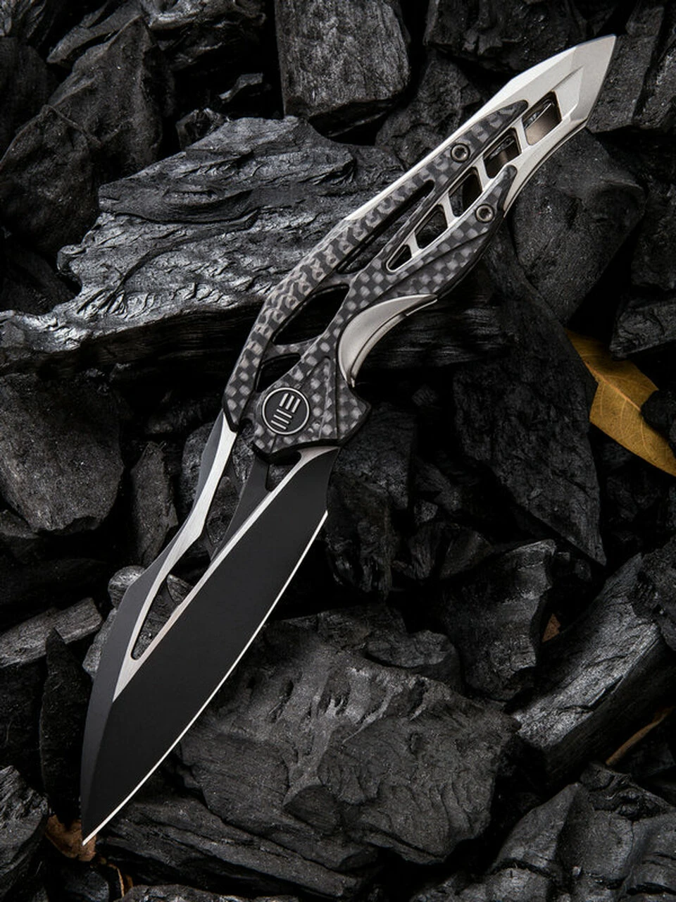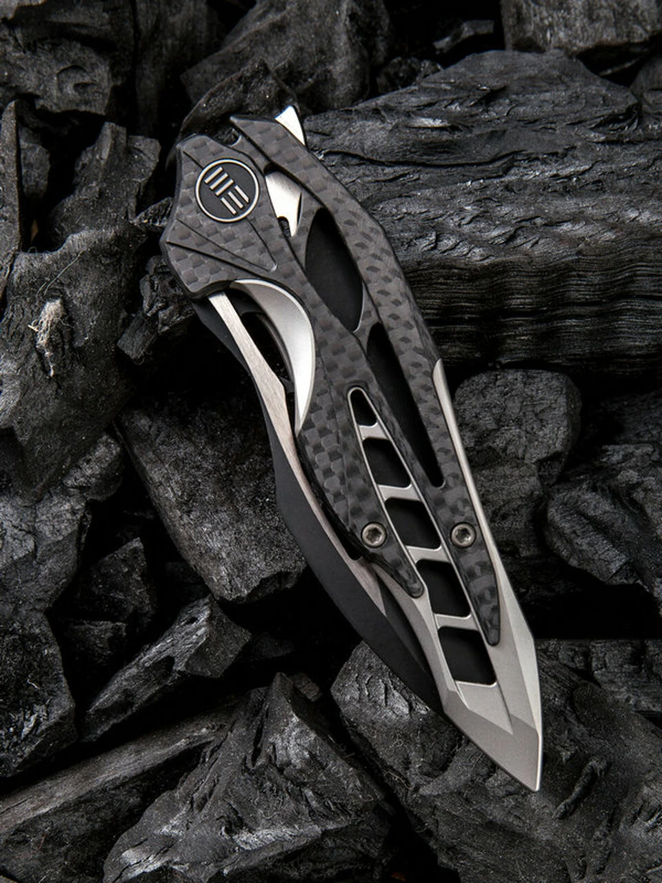 This model of the WE Knife Co. Arrakis sports a carbon fiber and gray titanium handle with a two-tone M390 blade.