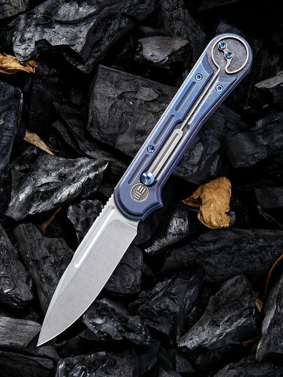 We Knife Double Helix Folder 815D, 3.3″ CPM S35VN Stonewash Drop Point Plain Blade, Blue Titanium Handle