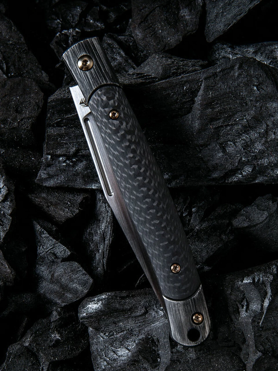 The WE Gentry is a high-end traditional slip joint knife featuring premium materials and design. The blade is made from CPM-S35VN steel and sports a hand rubbed black finish. A carbon fiber inserts rests inside of the black titanium handle. A lanyard hole is provided for convenient, every day carry.