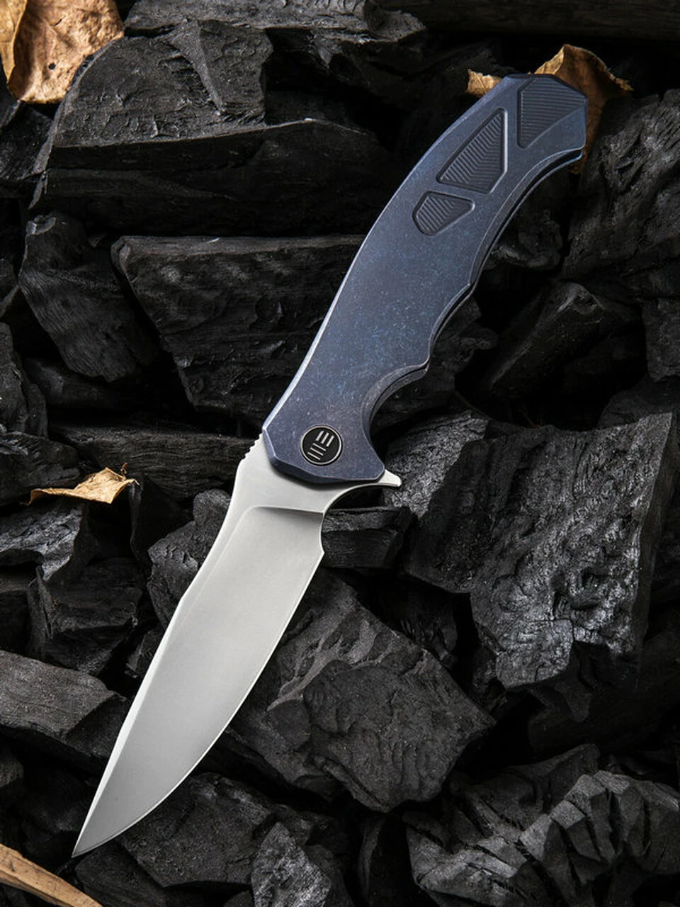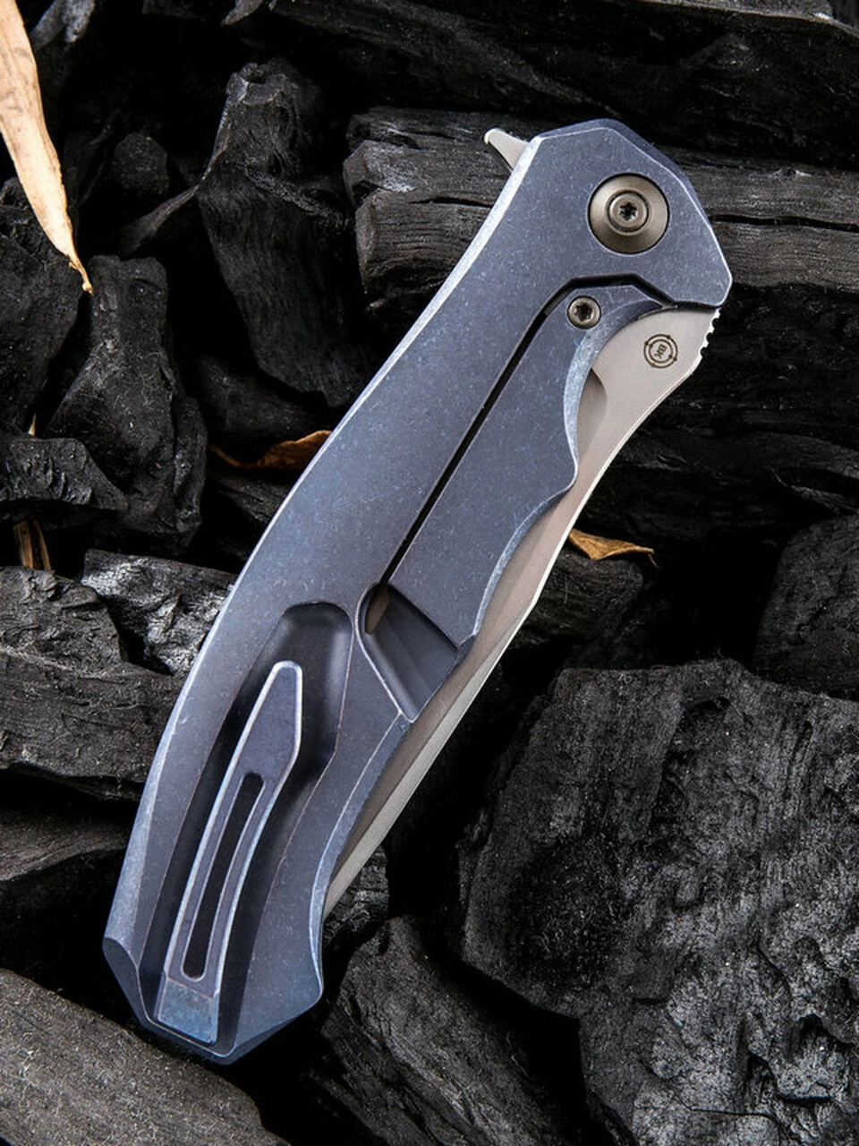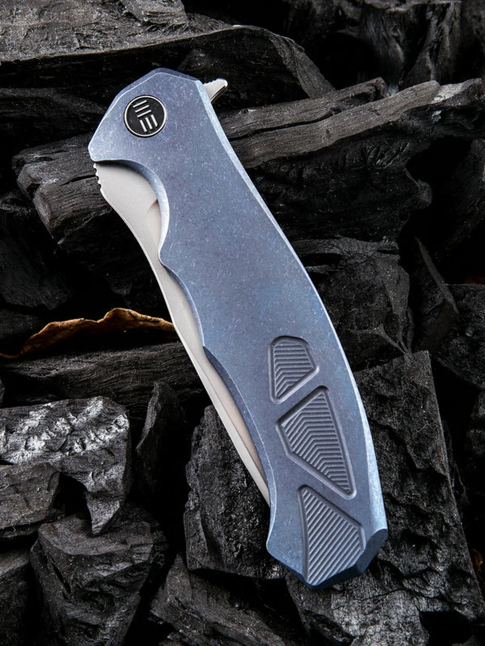 Advanced ergonomics are on full display on the model 037 from WE Knife Co. and designer Kellen Bogardus. This 037 is built with a polished bead blast blade and a blue titanium handle. Add an exciting EDC design to your collection with the WE Knife Co. 037.