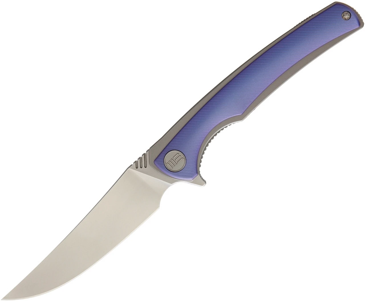 We Knife Model 704 Linerlock Folder 704B, 3.6” Bohler M390 Satin Trailing Point Plain Blade, Blue Anodized Textured Titanium Over Titanium Handle