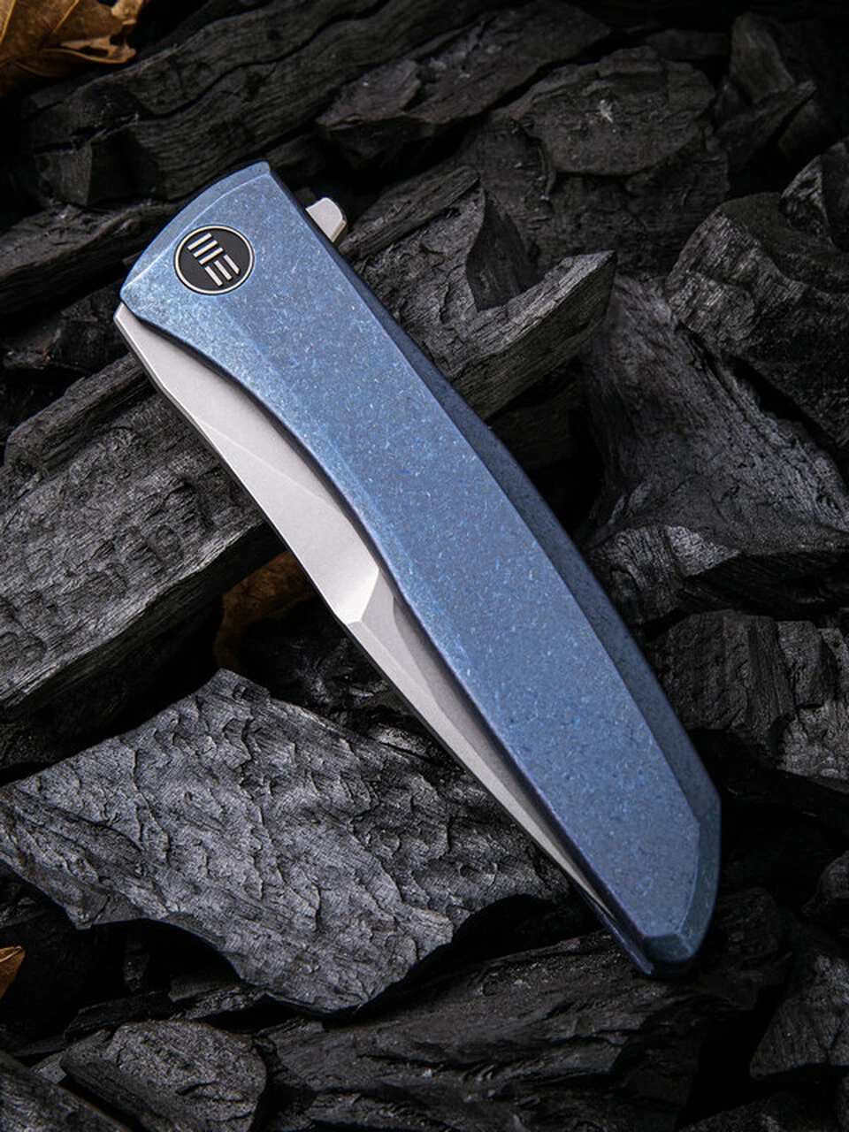 We Knife Co. We Knife Scoppio Framelock Folder 923A, 3.63″ CPM-20CV Stonewash Drop Point Plain Blade, Blue Titanium Handle