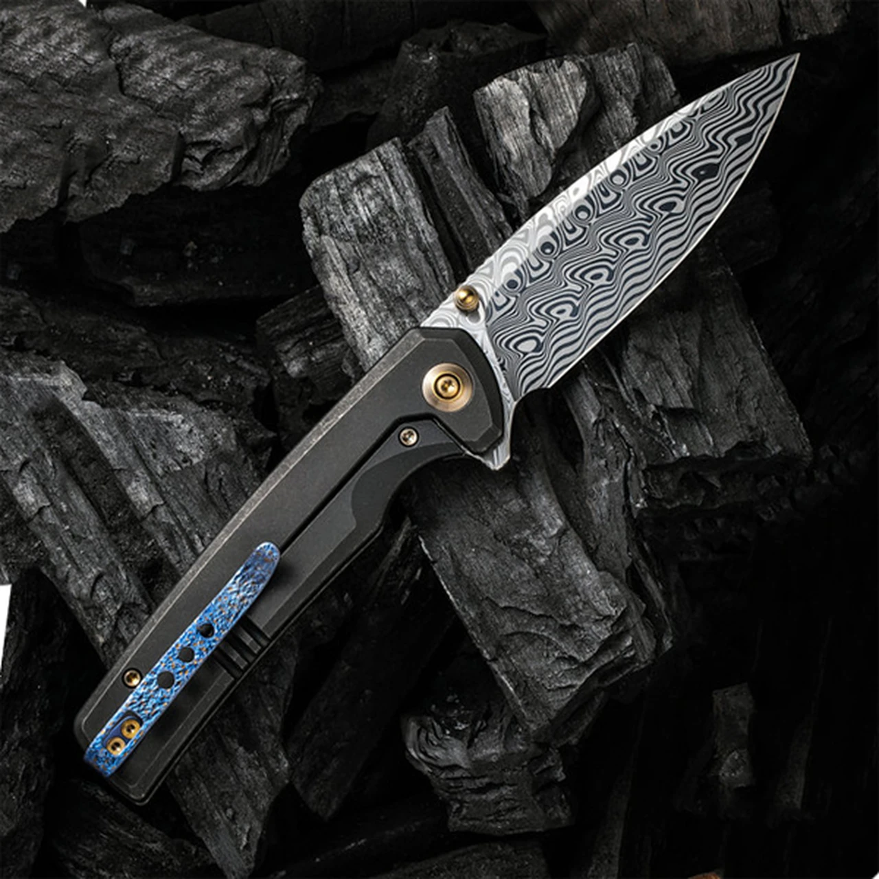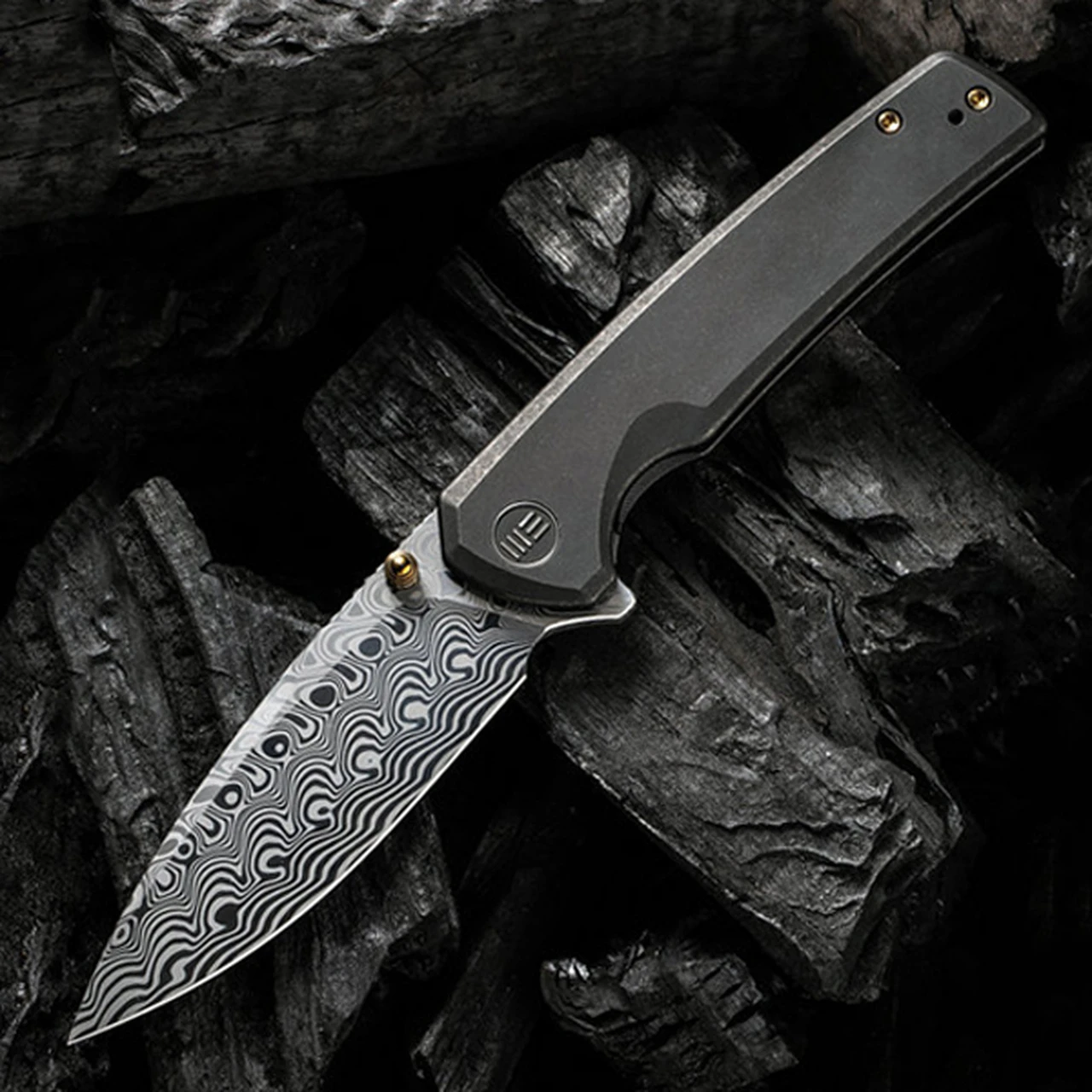 WE Knife Co. Subjugator Frame Lock (WE21014C-DS1) – 3.48″ Hakkapella Damasteel Drop Point Blade, Black Titanium Handle