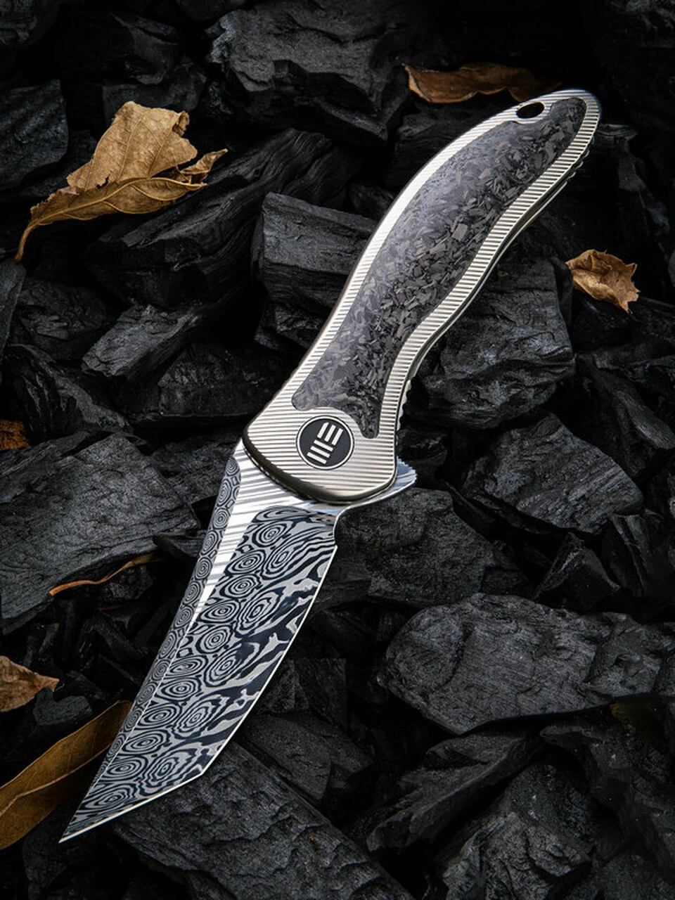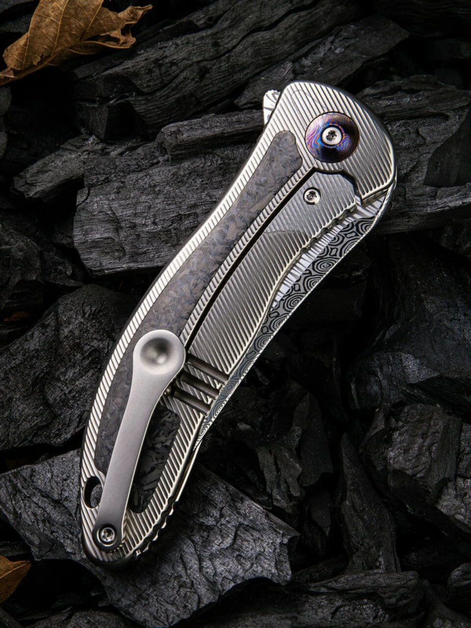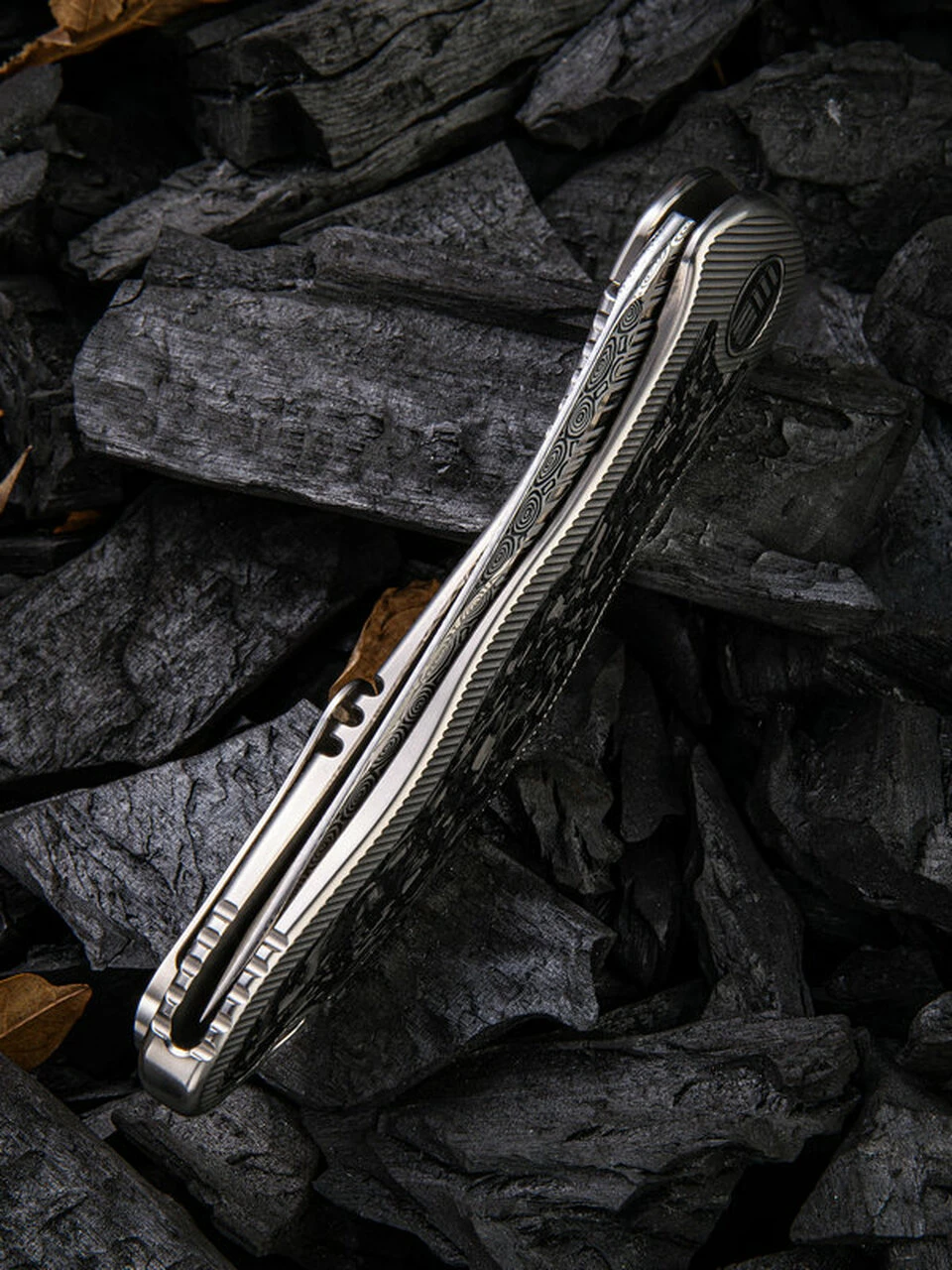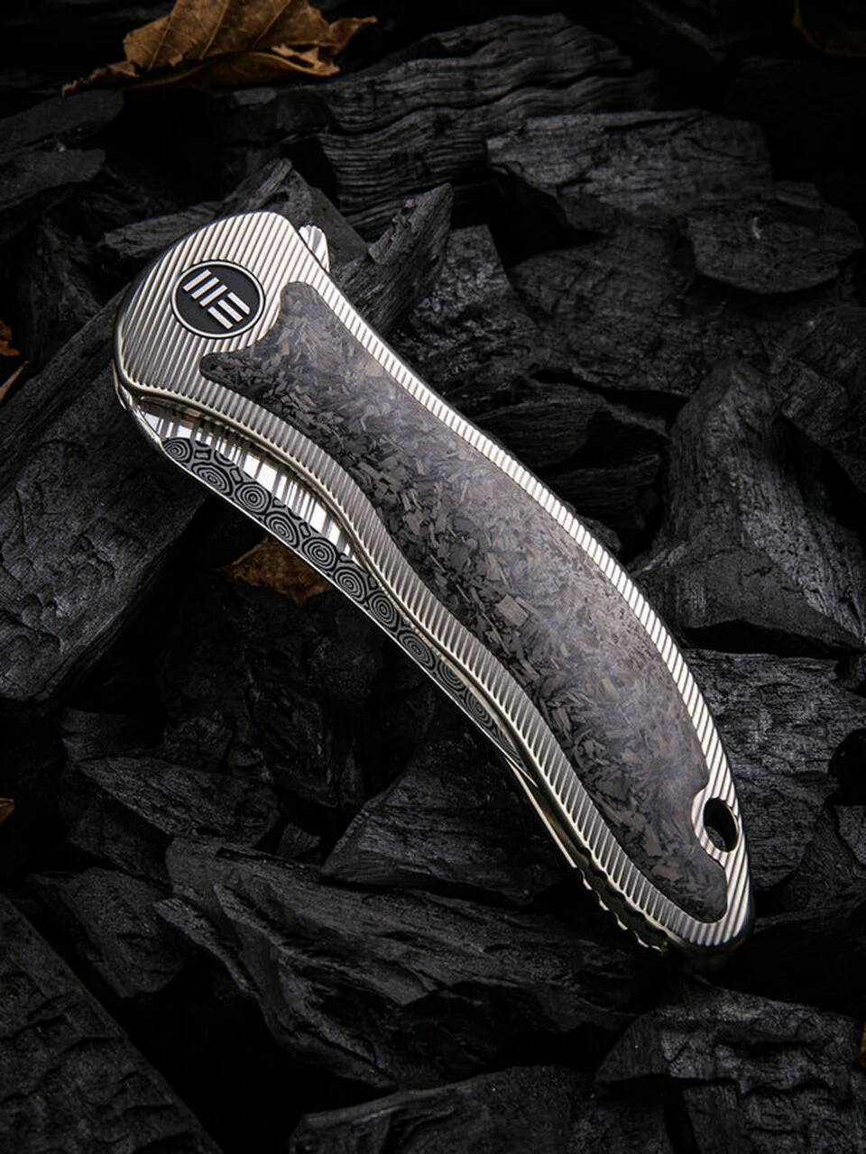 We Knife Synergy 2 Framelock Folder 912CFDS2, 3.49″ Heimskringla Damasteel Tanto Plain Blade, 6AL4V Titanium with Shredded Carbon Fiber Inlay Handle