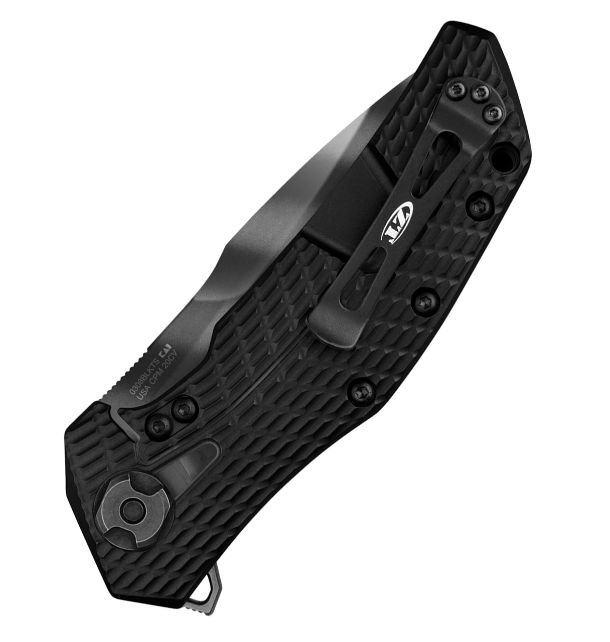 For the first time ever, ZT is using a black-oxide BlackWash finish with its classic tiger stripe pattern. The 0308BLKTS offers a beefy 3.7-inch tiger stripe blade with premium CPM 20CV blade steel. The handle features black G10 on the front scale with a titanium back. Both the front and back are heavily 3D machined for an ultra-secure grip. The .25-inch solid pivot features a custom nut that enables it to be adjusted in the field with a 1/2-inch wrench. The pocketclip hole pattern is compatible with many after-market clips.